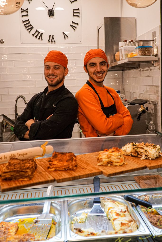 «L’idea – ci racconta – è venuta in casa a me e al mio coinquilino guardando e mangiando un pezzo di lasagna del giorno prima. Ci siamo detti ‘Ma sai che… non sarebbe così male trovare per strada un localino dove prendere una lasagna al volo e mangiarla passeggiando!’. Poi ne ho parlato anche con gli altri e oggi eccoci qui».