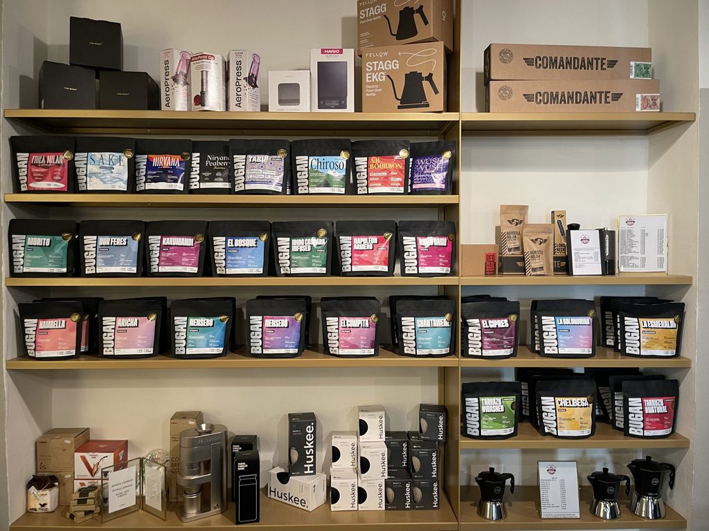 E dunque, altro che “prendo un caffè e scappo”: da Bugan sembra quasi di entrare in un laboratorio segreto, dove ogni tazzina è un esperimento, tanto non mi stupirei di vedere Hattori Hanzo sciabolare chicchi di caffè. In uno spazio che ribalta un po’ l’idea di caffetteria italiana, qui invece dal design un po’ nordico, mi accoglie Maurizio Valli, già proprietario insieme alla sorella Sonia di due caffetterie a Bergamo, ora approdato al Naviglio, a pochi minuti da Porta Genova. Dopo i convenevoli, arriva la sorpresa: un caffè che non avevo mai bevuto prima. Sentori di melone, anguria, agrumi— sì, davvero, altro che “caffé nero bollonte”. Perché il caffè, appunto, è un percorso esotico che ti guida verso lidi iconici: Sud America, Centro America, Centro Africa, sud dell’India. Ogni tazza racconta la storia di una piantagione e stupisce con profumi e gusti figli del terroir in cui cresce.