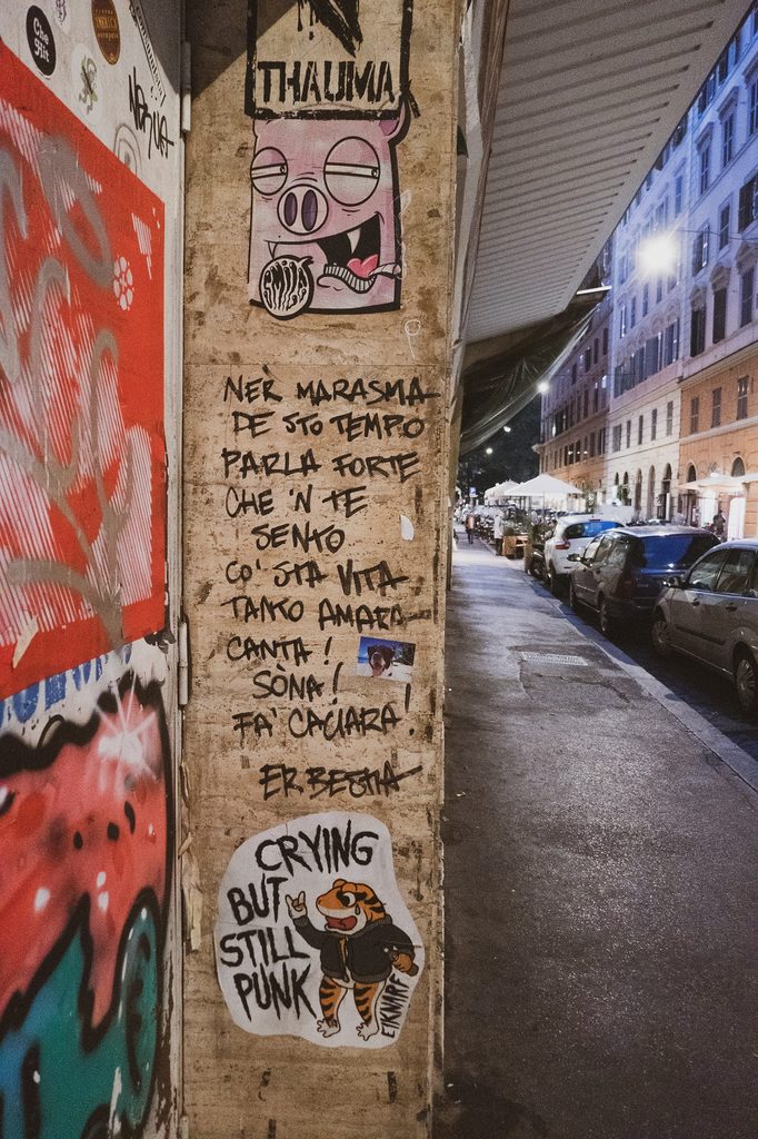Affollato, talvolta molesto e violento di notte, Trastevere mostra l’altra faccia di giorno, ed eccolo poetico, colto e popolare, verace e per certi versi solidale, ancora crocevia di ogni genere di anime e vissuti sociali. Seppur snaturato, gentrificato, trasformato in quartiere per ricchi, per turisti e affitti d’oro su airb’n’b, nel suo cambiamento perpetuo mantiene un’identità multiforme e contraddittoria: come multietniche erano le sue origini (rione di pescatori, ma anche di immigrati orientali in epoca augustea), come aperta e conviviale è sempre stata la sua vocazione – seppur un senso di appartenenza e di predominanza territoriale è intrinseca al carattere dei suoi abitanti autoctoni – così oggi la colonna sonora del rione è un insieme di lingue e dialetti, impudentemente appiccicate su un panorama da cartolina.