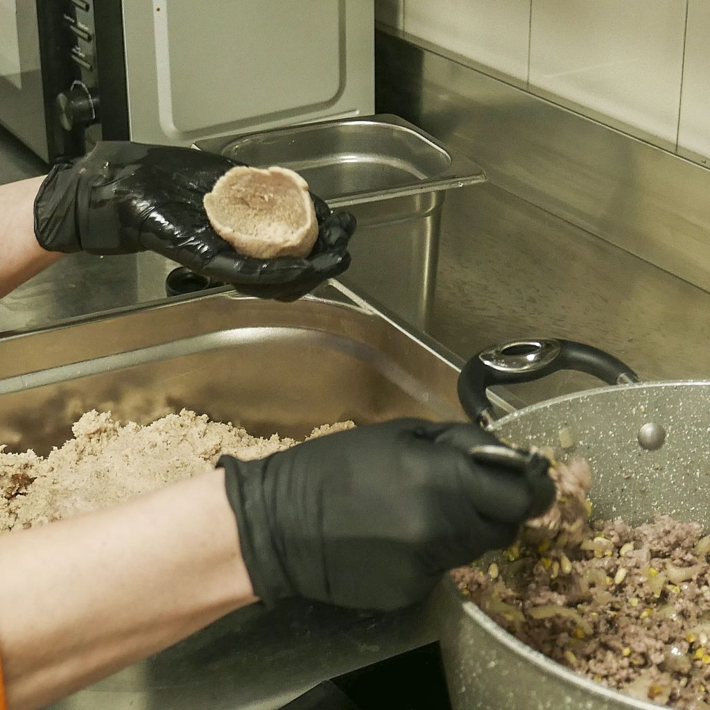 A valere la visita sono, però, soprattutto i kebbe, scrigni di bulgur che proteggono questo ripieno di carne, pistacchi e pinoli morbido e speziato secondo lo stile di Aleppo, «la capitale mondiale dei kebbe», mi assicura Habib quando ci troviamo nelle cucine di via de’ Castagnoli per prepararli insieme. «L’impasto – racconta Shaza mentre con le mani ne dà la classica forma ovale a una velocità e una omogeneità impressionante – è probabilmente una delle preparazioni più complicate della nostra cucina, perché per farlo a mano ci vuole almeno un’ora solo per ottenere che bulgur, carne e spezie si mescolino nel modo giusto».