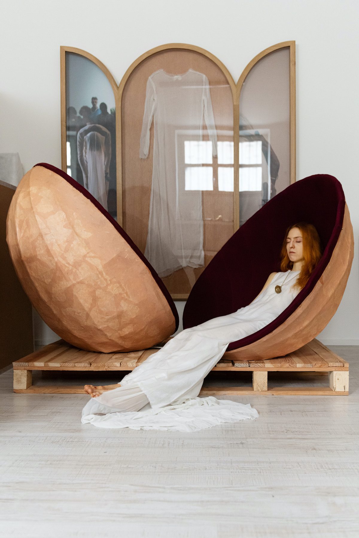 “Sposata con l’arte”, Reverie, artista visiva e performer, usa il suo corpo, la sua emotività e la sua empatia come fulcro principale della sua ricerca e di ogni singolo lavoro. Le sue opere fisiche – poesie, sculture, video, fotografie, abiti – di cui la sua casa-studio, posizionata subito sotto il pelo della strada, si fa vetrina – sono spesso testimonianze di sensazioni e ricordi collettivi che rielabora attraverso differenti tipologie di materiali quali vetro, ceramica, seta e bronzo. La figura della perla e della rosa, insieme alla dimensione del sogno, sono elementi fondamentali alla base del suo lavoro.