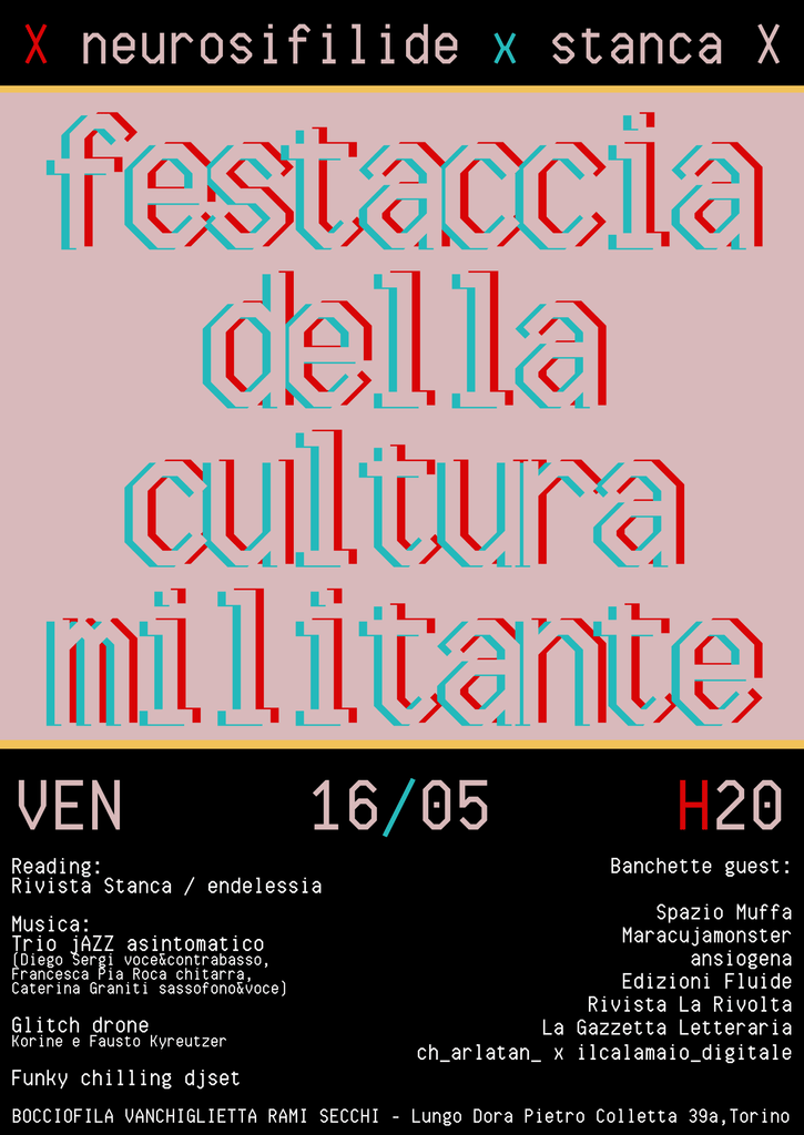 Venerdì 16 maggio doppietta: speed date sui drammi del lavoro culturale (lo sappiamo che anche voi state aspettando da cinque mesi quel bonifico per il long form sugli abusi agli operai dell’Ilva) a cura del sindacato dell’editoria Redacta, dalle 19,30 a Casa Garibaldi; mentre dalle 20 vi aspetta, alla Bocciofila Rami secchi, la Festaccia della cultura militante organizzata da Neurosifilide (fanzine anarco-cringe) e Rivista Stanca (literally), banchette di riviste autoprodotte e musica. Dopo un reading corroborante di Stanca e Endelessia, l’intrattenimento musicale sarà affidato al trio jAZZ asintomatico (Diego Sergi, Caterina Graniti, Francesca Pia Roca), Korine e Fausto Kreutzer (glitch drone); a seguire Funky chilling djset.