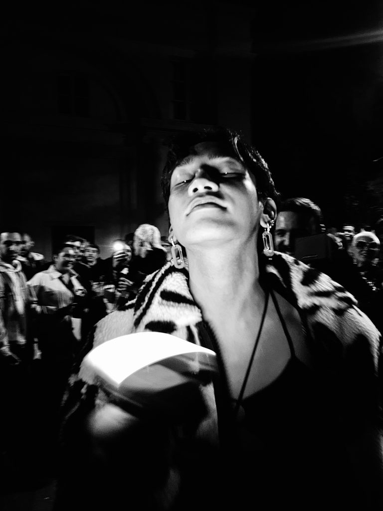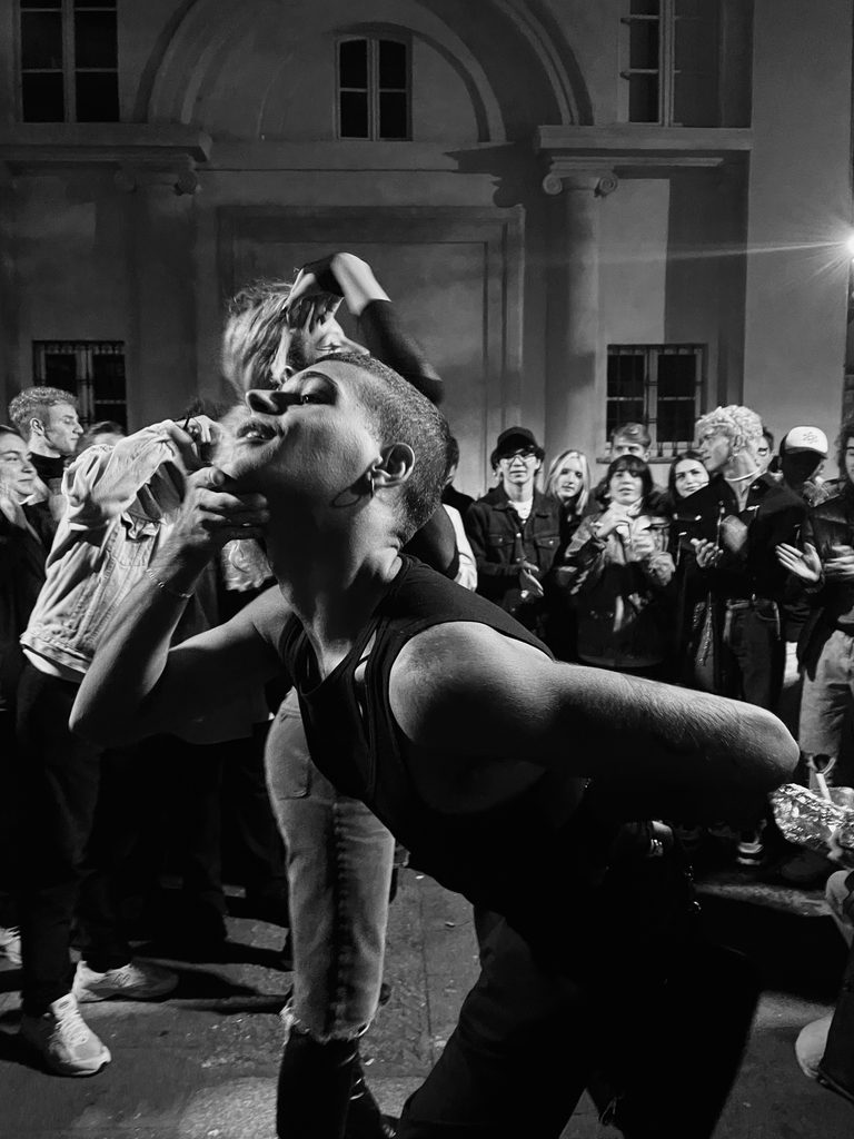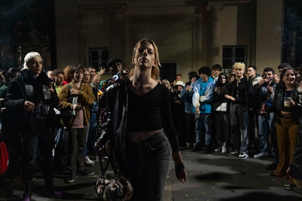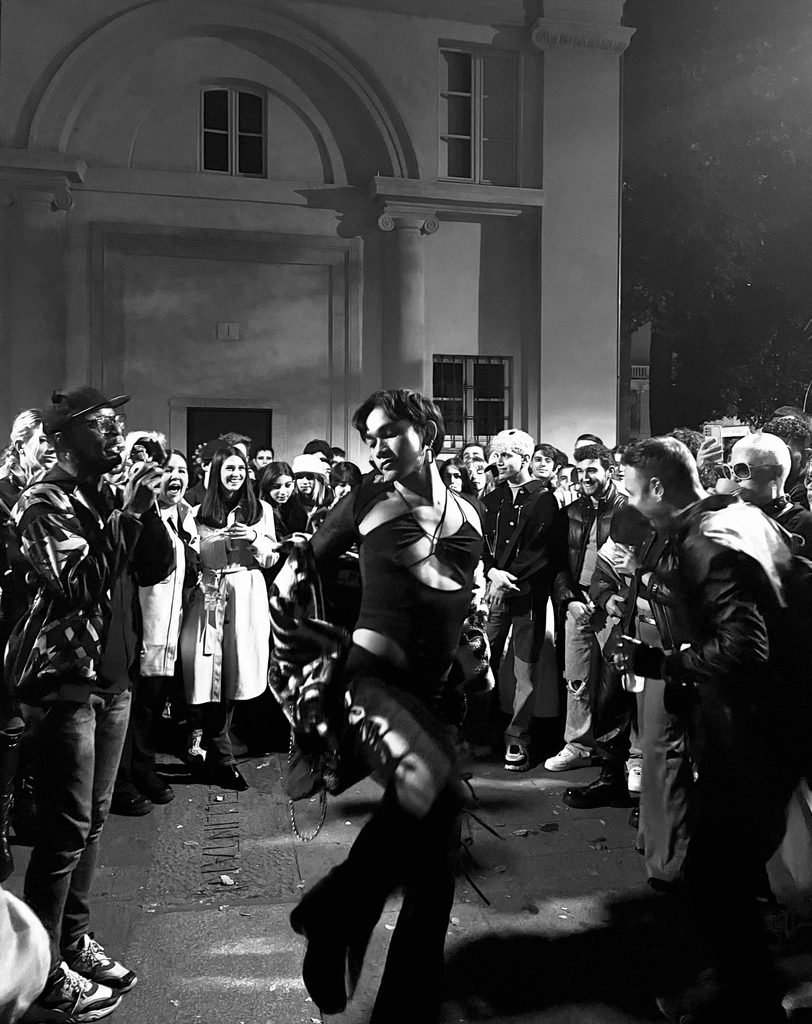 Lo scopo della serata, oltre quello di allenarsi e divertirsi, è portare in strada – in un luogo comune, centrale e pubblico – tutta la potenza dirompente del voguing per ricreare uno spazio fuori contesto e sbattere in faccia a chi filtra la realtà con i dettami machisti le storie e le esistenze di tutti. Se gli chiedo di essere più specifico, aggiunge senza indugio: “A Milano manca una vera comunità queer. Dove sono le persone di colore? Dove sono le transessuali? Certo, a Porta Venezia funziona bene la vita dei locali notturni, ma dove sta il supporto reciproco quando di giorno ci si ignora da una parte all’altra del marciapiede?” Se gli chiedo cosa pensa di Via Lecco è tranchant: “Una via dove la gente va a sfilare per poi parlarsi su un app di dating”.
