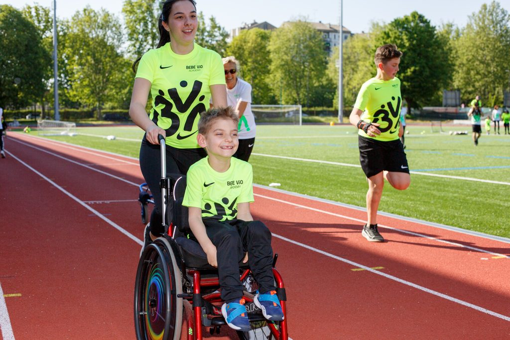 Chi può sulle proprie gambe e chi ha più difficoltà deambulatorie con l’aiuto dei race runner: tricicli senza pedali studiati apposta per l’atletica leggera paralimpica. Poi, a metà lezione, avviene lo switch tra i due gruppi, perché “alla BVA tutti devono provare tutto”. È una sorta di mantra che gli addetti ai lavori ripetono spesso e che ben rispetta non solo in concetto di inclusività ma anche lo scopo dell’iniziativa, che è l’avviamento sportivo.
