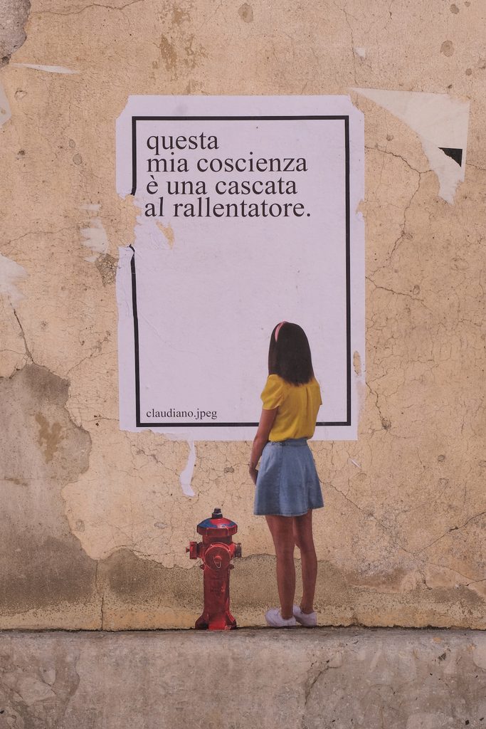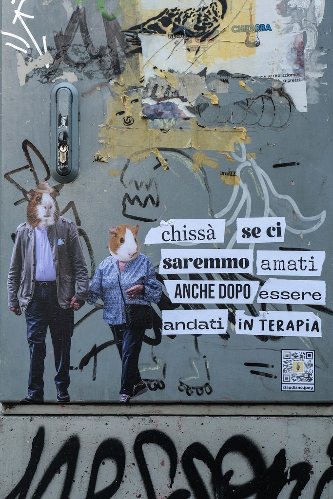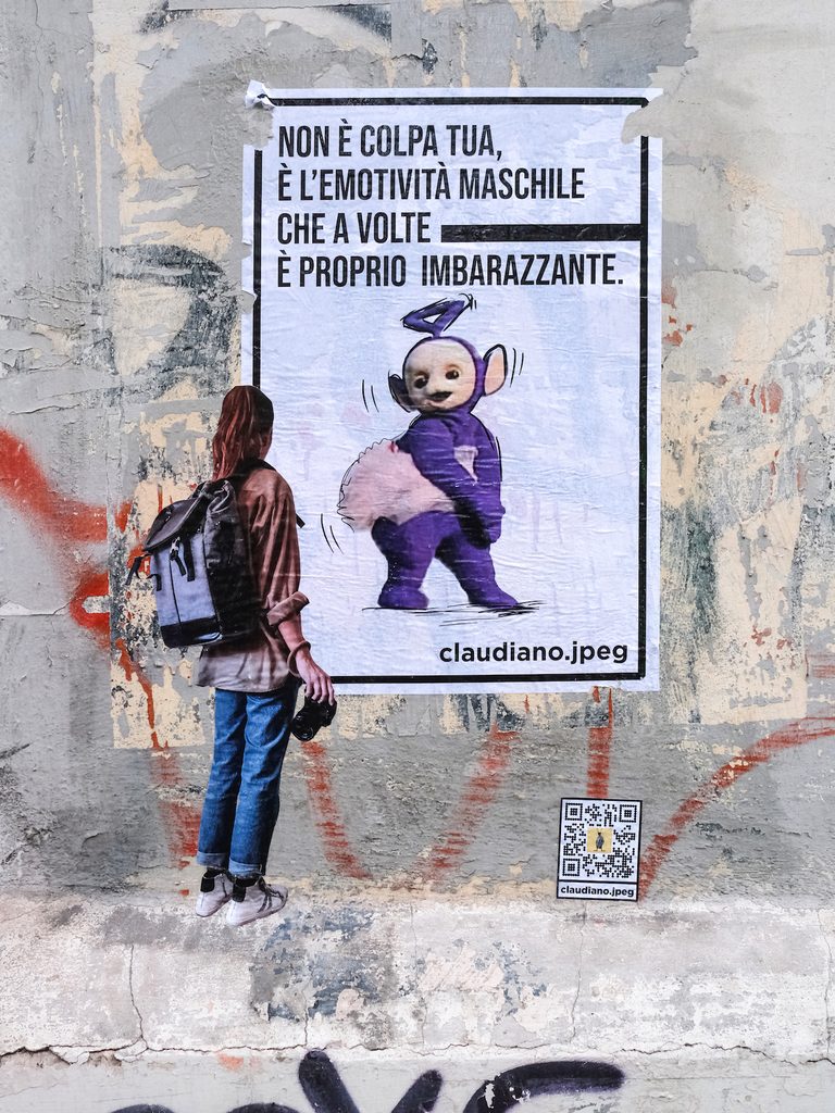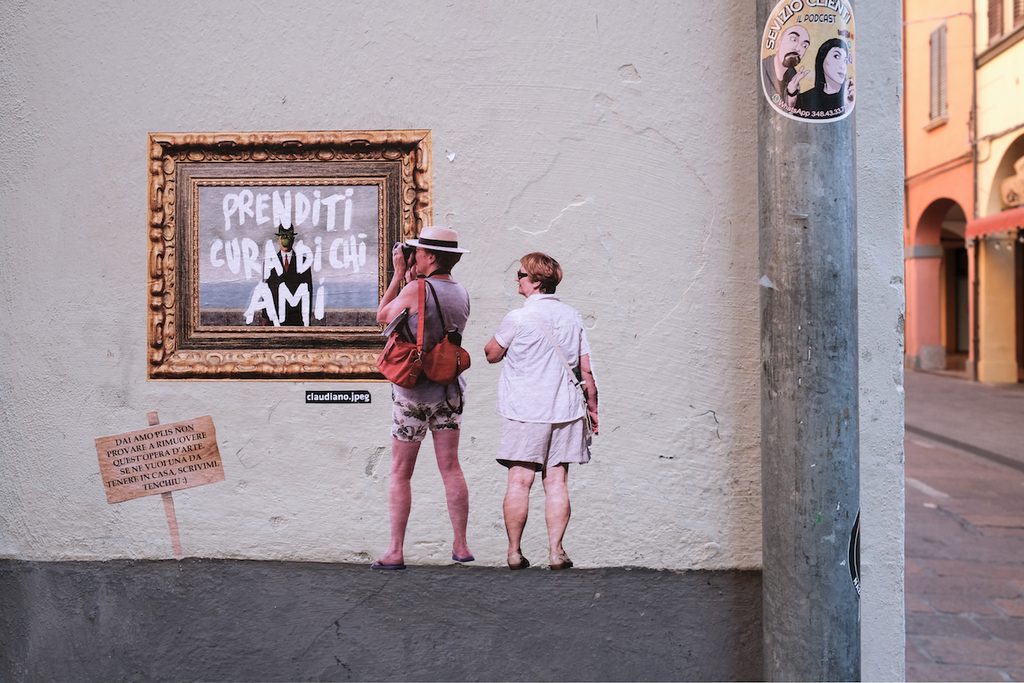 I suoi lillipuziani da qualche anno sono entrati a far parte della caotica identità „muraria“ della città: personaggi di carta minuscoli tra turisti in ciabatte, coppie di anziani, studenti e soprattutto animali antropomorfi che dispensano massime sulla vita, l’amore e la famiglia appoggiati ai contatori del gas, negli angoli dei portici o in qualche anfratto in attesa di essere spazzati via dalla pioggia o dalle nettezza urbana. Dalla provincia toscana alle strade di Bologna, Claudiano.jpeg, classe ’92, ha sviluppato la sua arte unendo grafica, illustrazione e fotografia sbarcando con successo prima su instagram e poi nella sua prima mostra bolognese che, non a caso, è intitolata Non è bello ciò che è bello ma è bello ciò che è instagrammabile dal 31 gennaio al 18 febbraio in Biblioteca Salaborsa a cura di Succede solo a Bologna.
