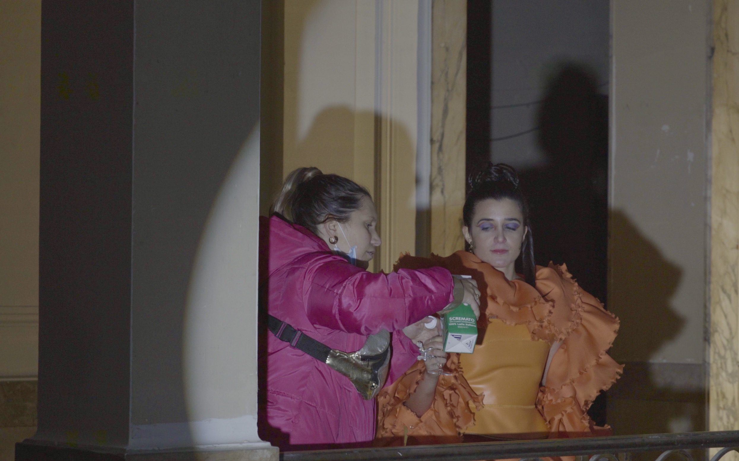 L’abito arancione e quello rosso me li ha prestati Amorphose, designer italiano basato in Svizzera con cui ora comincerò a collaborare anche per altri super progetti. Gli outfit di Salvatore Vignola e di Vitelli sono merito della ricerca e del lavoro di quel talento di Yasmin Leite che ha anche ideato e creato i make up e le acconciature stupende. E… le bocche e gli occhi sui body delle ballerine e sul mio li abbiamo disegnati e creati mia mamma ed io: lei sa fare e cucire tutto e da quando sono piccola ci inventiamo travestimenti, cosa di cui sono da sempre stata appassionata!