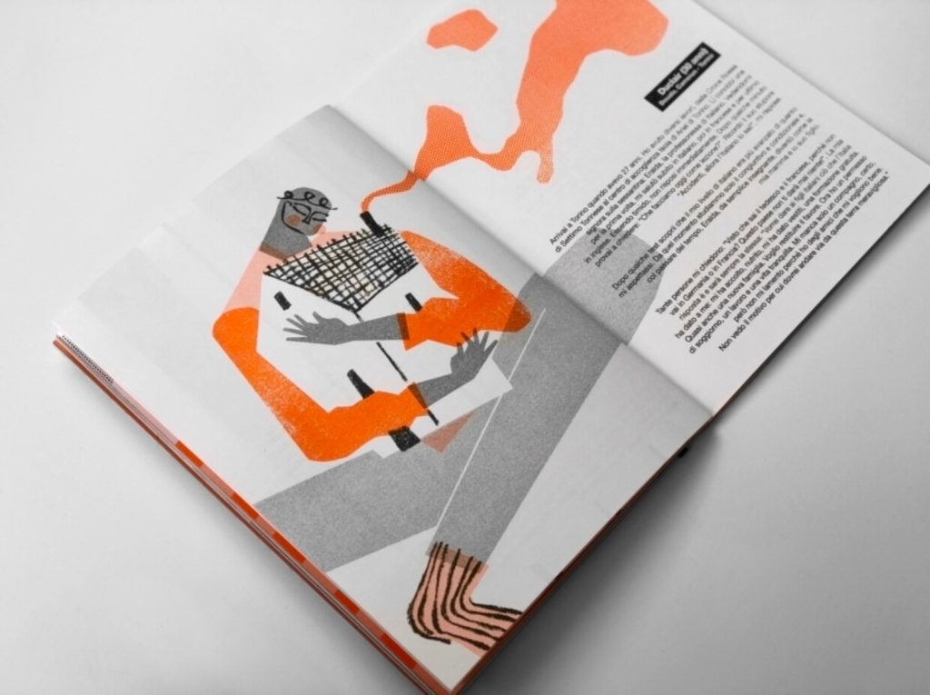Il mio preferito in assoluto è stato un libro che ho pubblicato l’anno scorso che si chiama Sono qui, fatto in qualche modo per il mio primo decennio in Italia. Sapevo che volevo creare qualcosa ma non sapevo cosa. Una stampa o un’illustrazione. E ho scelto per un libro, giusto per complicarmi un po’ la vita. Il libro è interamente autoprodotto e accoglie storie di altri: storie di immigrati che hanno subito gesti di gentilezza arrivando in Italia. Contiene dieci storie di dieci persone che arrivano da tutto il mondo che ci raccontano quanto sa essere accogliente questo paese. La posizione politica è vergognosa, alimenta e diffonde solo situazioni negative, quindi ho cercato di rappresentare la mia esperienza che è stata bellissima. Non voglio ignorare le cose negative ma onorare quelle positive con storie brevi ma molto belle. È un libro che rappresenta molto bene me, anche se non ci sono in prima persona.