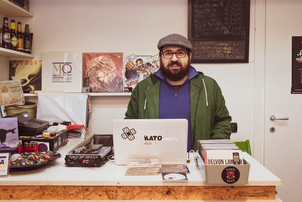 «Mi chiamo Luca Caminiti e ho 38 anni. In molti mi conoscono come Kato o Fidel Kato, nome che uso da tanti anni quando faccio musica. Vengo dal litorale romano, ho vissuto gran parte della mia vita tra Ostia, Acilia, Infernetto. Ho iniziato a fare rap quando avevo 17 anni insieme a Antonio Oren. Poco dopo a produrre beat e a campionare. Da lì è iniziato un viaggio infinito nel mondo del vinile». Si presenta così il titolare del Mangiadischi Record Shop, a San Lorenzo: un ibrido tra negozio di dischi in vinile e birreria, situato in via degli Equi a ridosso dell’incrocio con via dei Volsci. Ambiente piccolissimo ma dall’atmosfera conviviale, dove scambiare due chiacchiere, sorseggiare birra e farsi consigliare buona musica direttamente dal negoziante, proprio come accadeva abitualmente qualche decennio fa – impossibile non tornare con la mente al mai dimenticato Disfunzioni Musicali che proprio a San Lorenzo aveva la sua storica sede. Una scelta apparentemente rischiosa quella di aprire un negozio di dischi in piena era digitale. Ma è da novembre 2016 che il Mangiadischi “resiste” e sembra tutt’oggi in ottima salute.