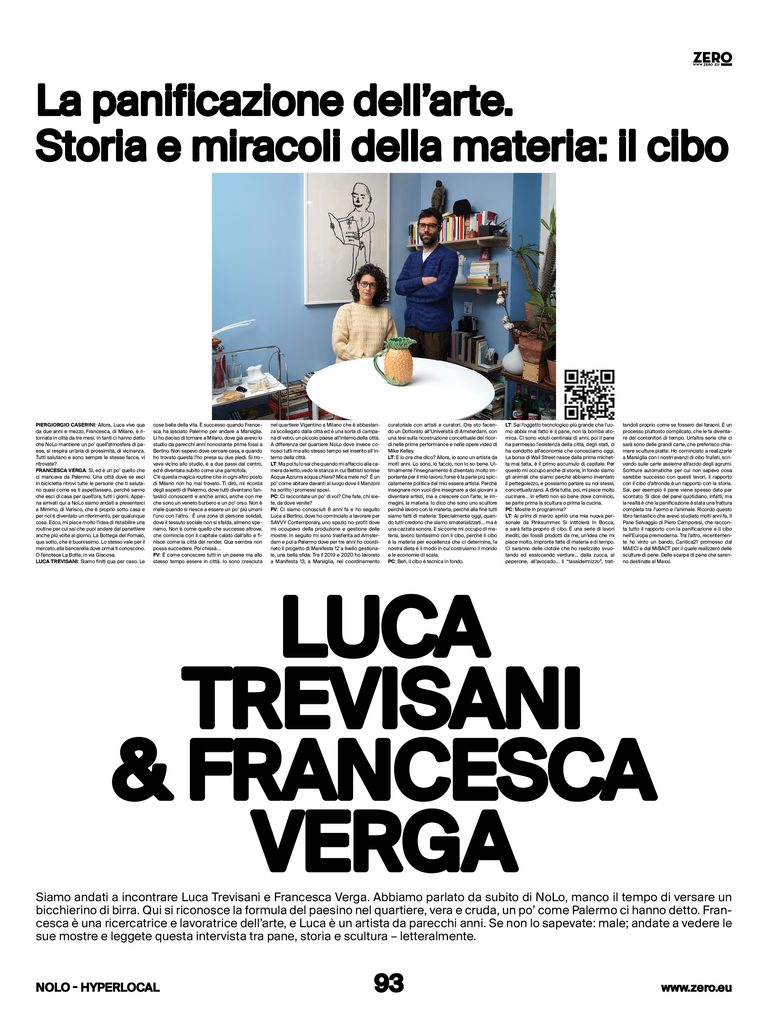 Siamo andati a incontrare Luca Trevisani e Francesca Verga. Abbiamo parlato da subito di NoLo, manco il tempo di versare un bicchierino di birra. Qui si riconosce la formula del paesino nel quartiere, vera e cruda, un po’ come Palermo ci hanno detto. Francesca è una ricercatrice e lavoratrice dell’arte, e Luca è un artista da parecchi anni. Se non lo sapevate: male; andate a vedere le sue mostre e leggete questa intervista tra pane, storia e scultura – letteralmente.