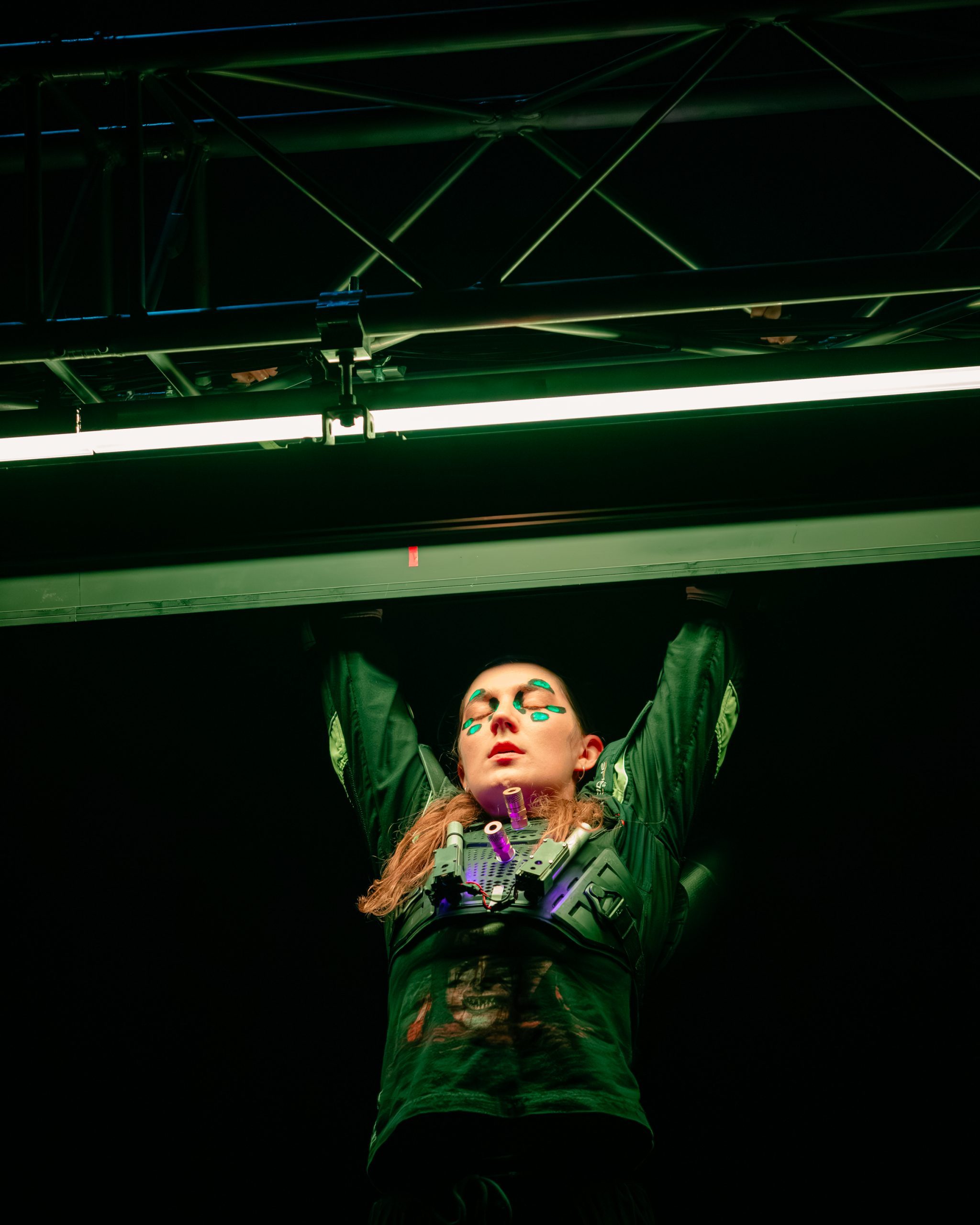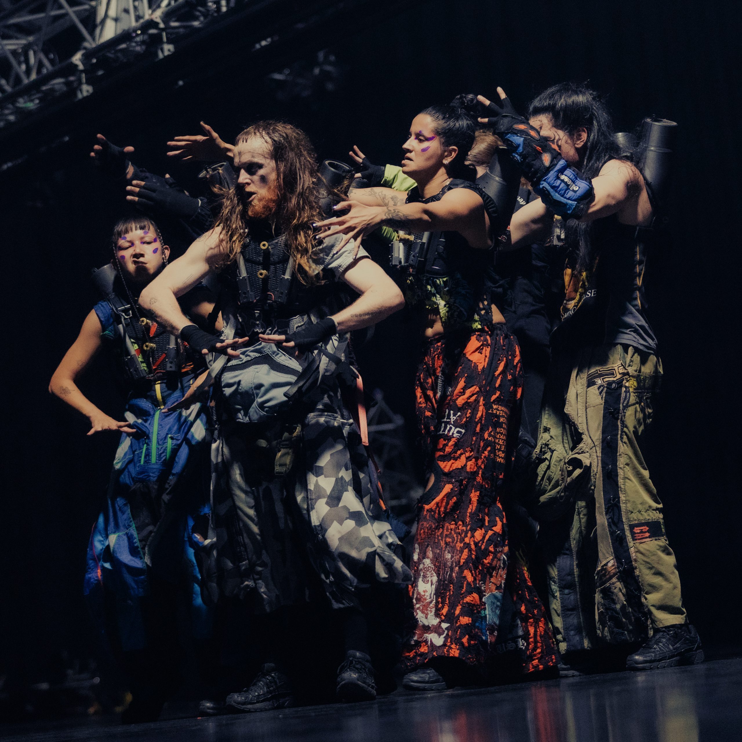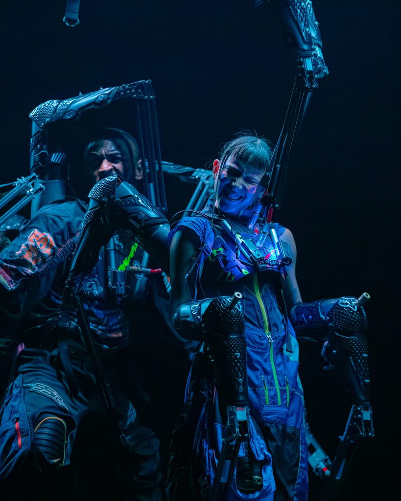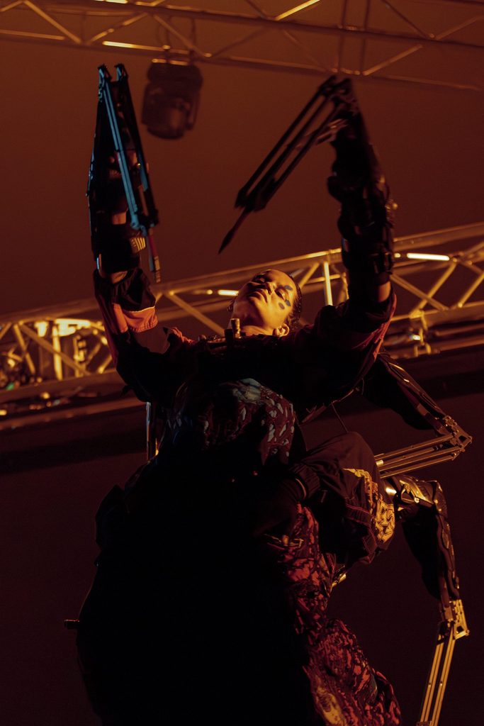 Future Loundry ha lavorato parallelamente a un’azienda di Melbourne che si chiama Creature Technology. Creature Technology ha realizzato le tute esoscheletriche, invece Future Loundry ha realizzato i costumi (t-shirt, felpe, pantaloni etc.). Future Loundry è un brand fondato da Ican di Gabber Modus Operandi e da sua moglie Manda. La sensazione che ho avuto è che la musica dei Gabber Modus Operandi non si potesse separare dalla parte visiva legata alla moda, perché parte di un unica storia, di un unica mitologia. Sia Creature Technolgy che Future Loundry hanno una sensibilità e un’etica comune, che li porta a riutilizzare materiale esistenti e a reinventarli attraverso un approccio creativo all’upcycling. Salvo alcuni piccoli elementi stampati in 3D, in „United“ è tutto riciclato, dagli esoscheletri ai costumi alla scenografia. Abbiamo utilizzato ad esempio serbatoi di auto che io e il mio responsabile di produzione abbiamo recuperato dagli sfasciacarrozze qui a Melbourne. È tutto molto DIY. La mia ispirazione proviene da alcuni artisti come RAMM:ΣLL:ZΣΣ, uno street artist d’avanguardia della New York degli anni Ottanta e anche un vero outsider nella scena hip-hop.