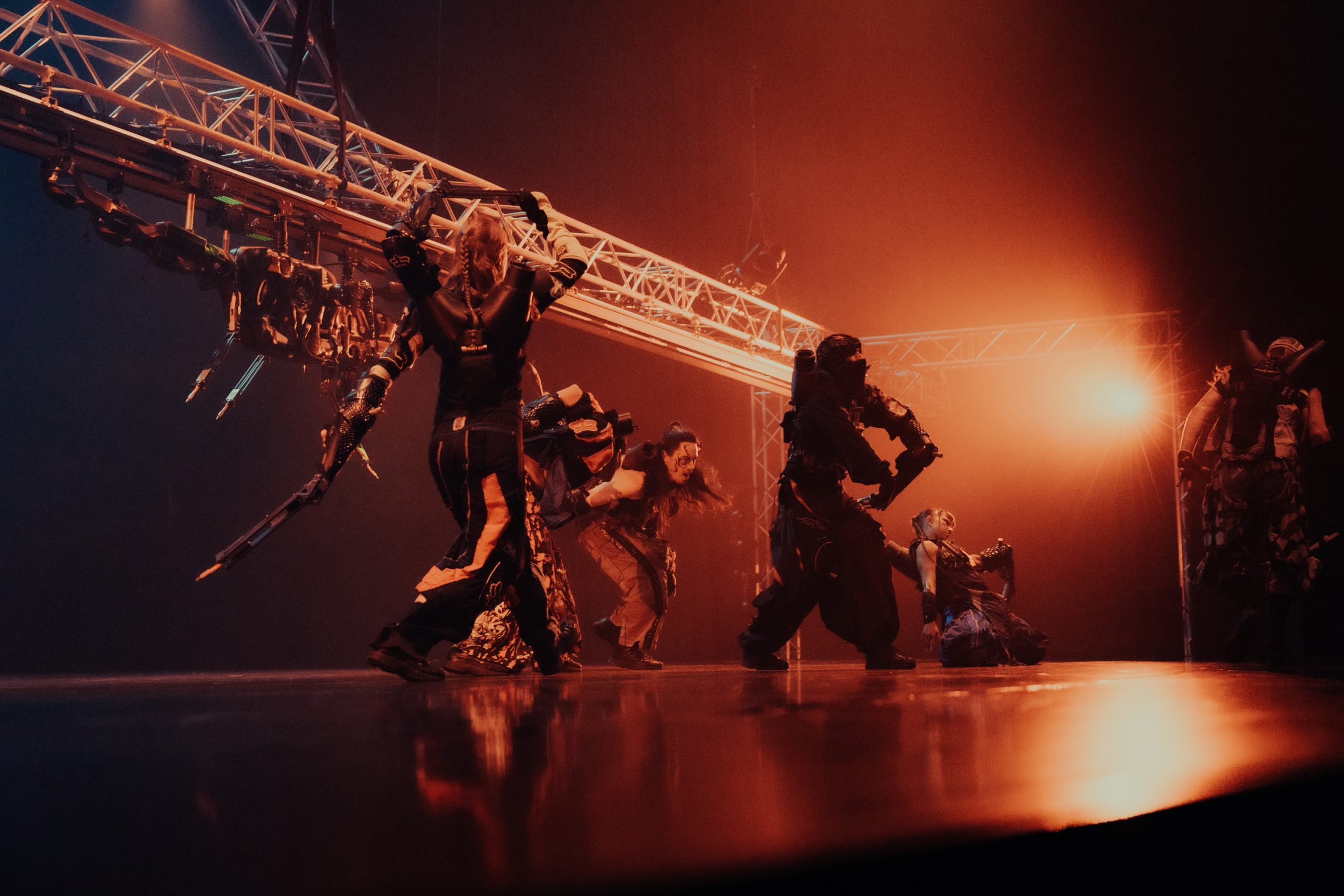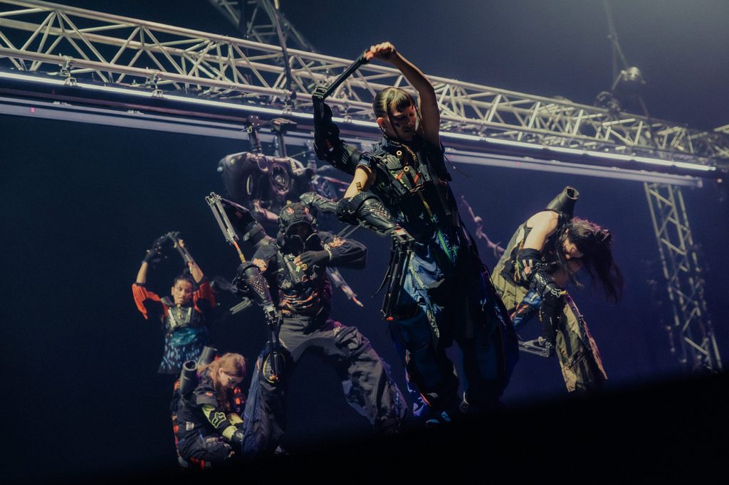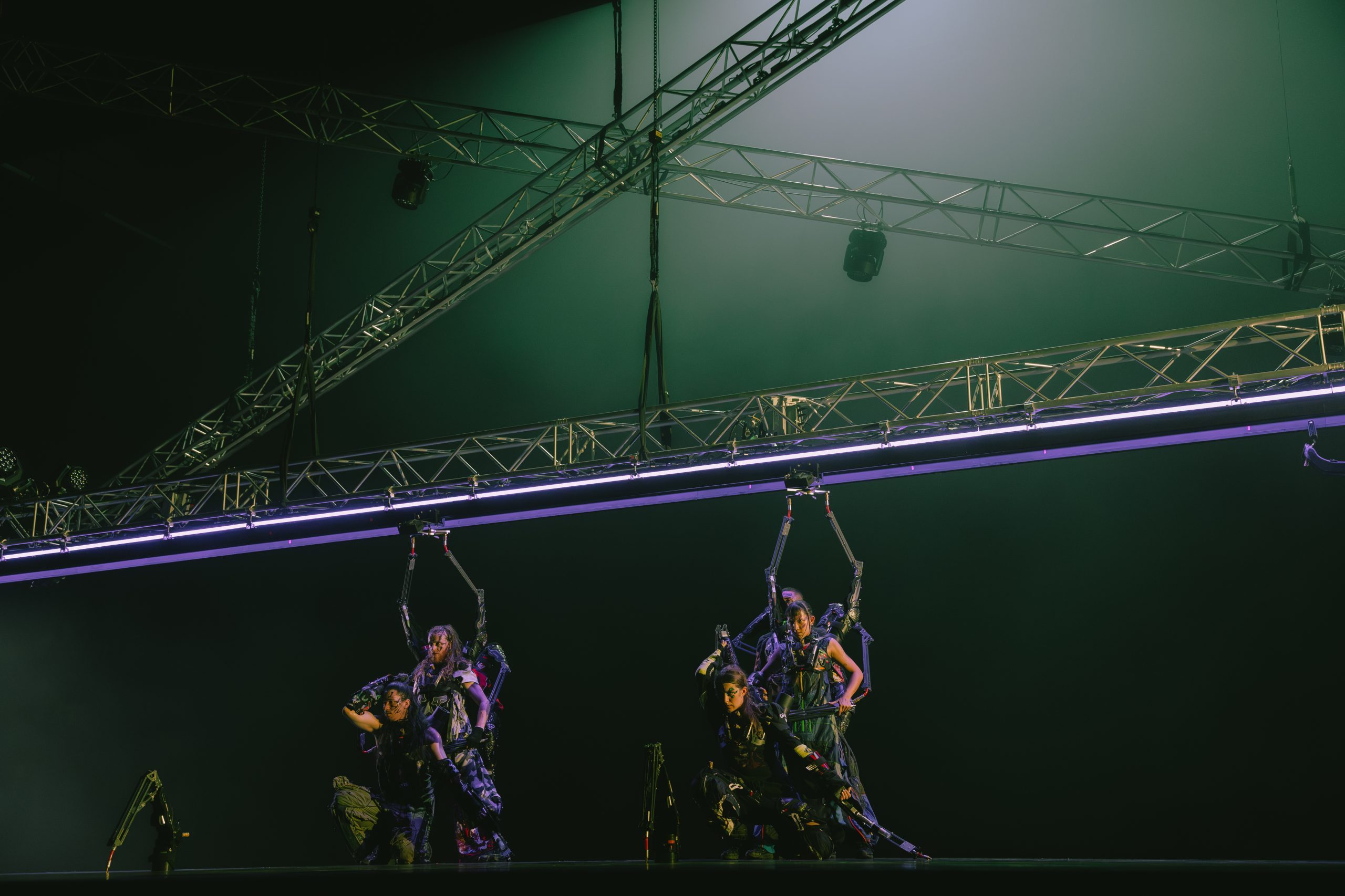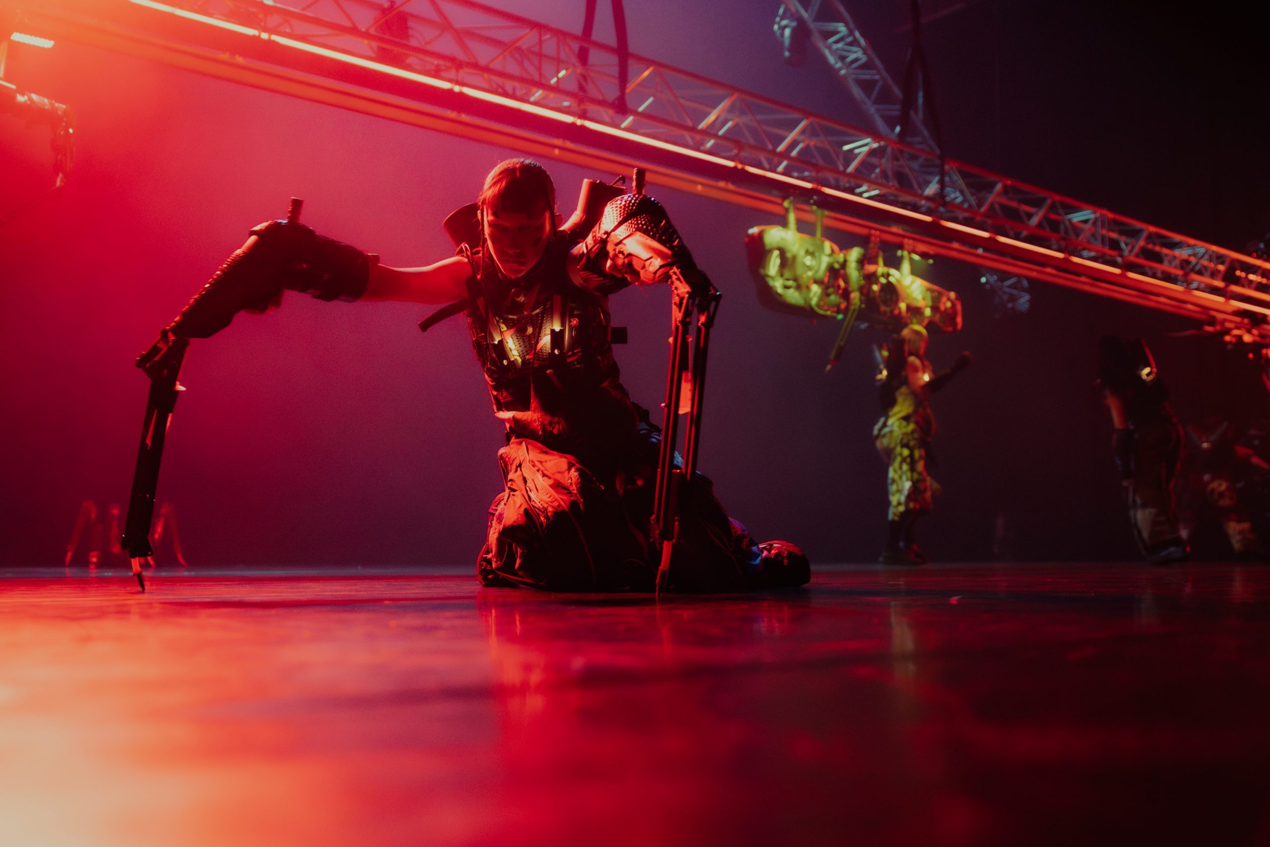 Future Loundry ha lavorato parallelamente a un’azienda di Melbourne che si chiama Creature Technology. Creature Technology ha realizzato le tute esoscheletriche, invece Future Loundry ha realizzato i costumi (t-shirt, felpe, pantaloni etc.). Future Loundry è un brand fondato da Ican di Gabber Modus Operandi e da sua moglie Manda. La sensazione che ho avuto è che la musica dei Gabber Modus Operandi non si potesse separare dalla parte visiva legata alla moda, perché parte di un unica storia, di un unica mitologia. Sia Creature Technolgy che Future Loundry hanno una sensibilità e un’etica comune, che li porta a riutilizzare materiale esistenti e a reinventarli attraverso un approccio creativo all’upcycling. Salvo alcuni piccoli elementi stampati in 3D, in „United“ è tutto riciclato, dagli esoscheletri ai costumi alla scenografia. Abbiamo utilizzato ad esempio serbatoi di auto che io e il mio responsabile di produzione abbiamo recuperato dagli sfasciacarrozze qui a Melbourne. È tutto molto DIY. La mia ispirazione proviene da alcuni artisti come RAMM:ΣLL:ZΣΣ, uno street artist d’avanguardia della New York degli anni Ottanta e anche un vero outsider nella scena hip-hop.