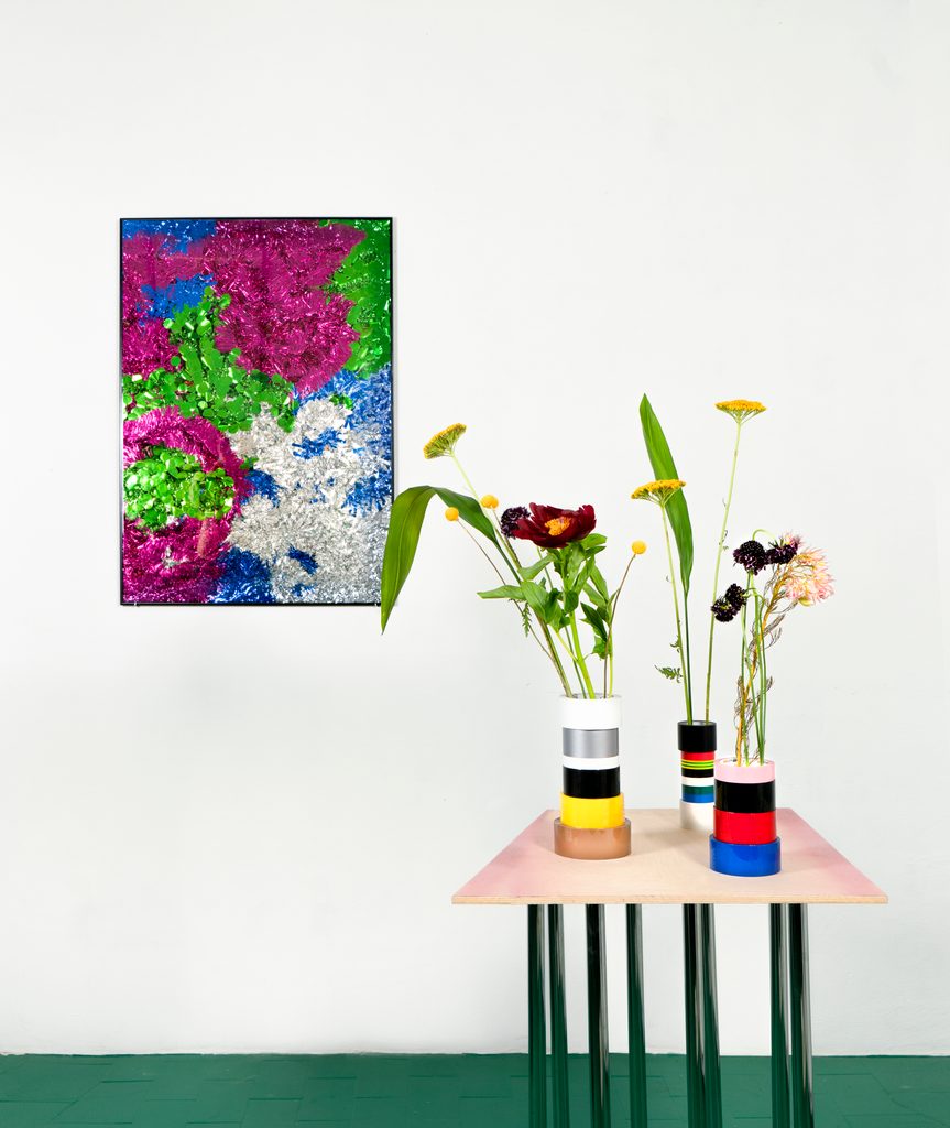 Per il Fuorisalone, quindi, studioamatoriale debutta. Il progetto è proprio di Angelo Castucci, accompagnato da un testo valorosissimo di Francesco Tola, altra anima dello spazio. Troverete una collezione di vasi all’apparenza improvvisati con oggetti da cancelleria e una serie quadri dai toni giocosi con suggestioni infantili – proprie di quel gioco che s’avventura per tentativi e all’apparenza è tutto spogliato di finalità. Perciò: scotch e carte luccicanti, fiori e cornici, blocchi di marmo e morbidi tappetini, tutto a metà tra una cartoleria, una camera di giocattoli e uno studio di progettazione, tra un pensiero da sdraio convintamente radicalizzato e una nuvola che pare il profilo di Testori.