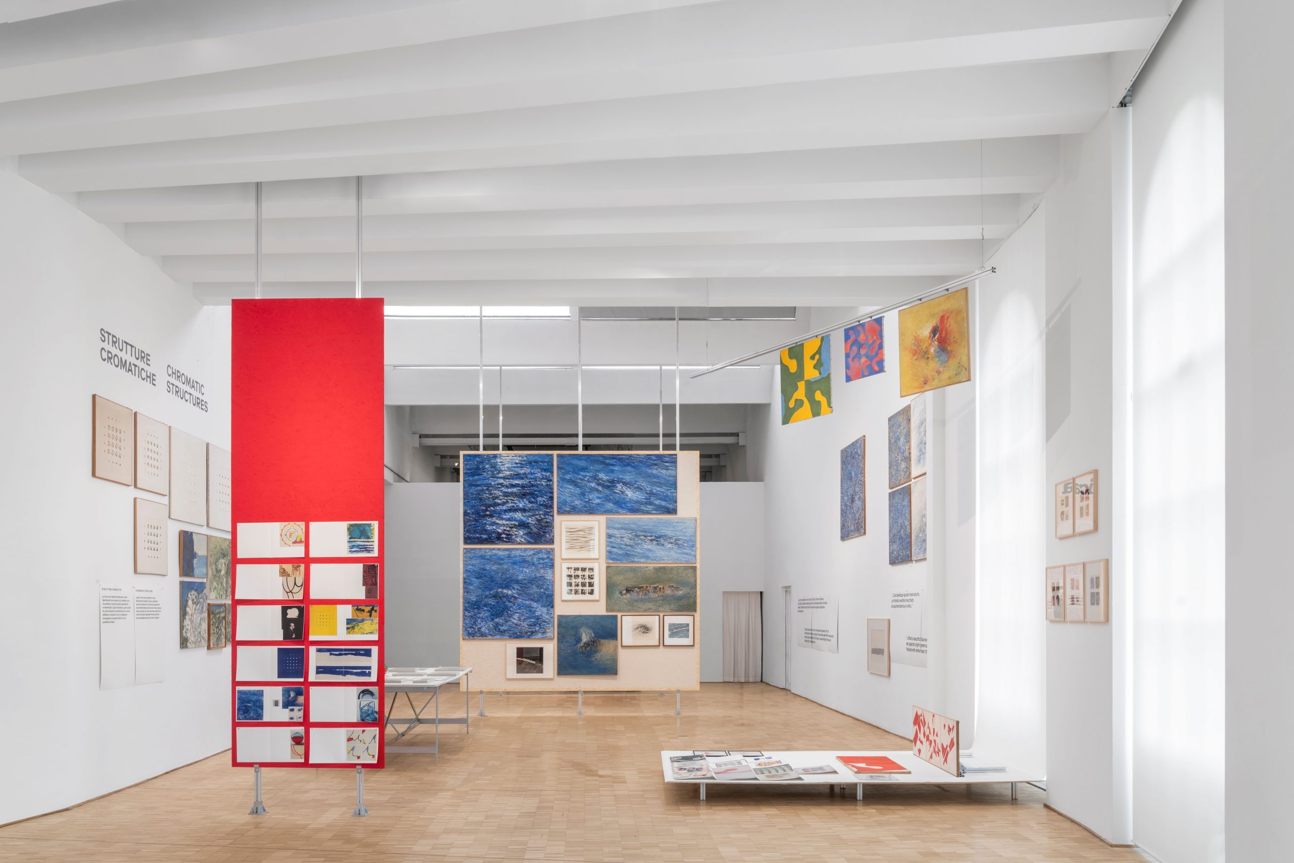 Una parete di cartoline spedite da Roberto ai suoi figli tra il 1965 e il 1970 mi separa dal corpo centrale della mostra, che scopro essere diviso in “strutture” da alte pannellature ricoperte di fotocopie rosse con schizzi, fotografie, scansioni, ingrandimenti, materiale di studio di Sambonet: circolari, ortogonali, triangolari, organiche, psicologiche, cromatiche.