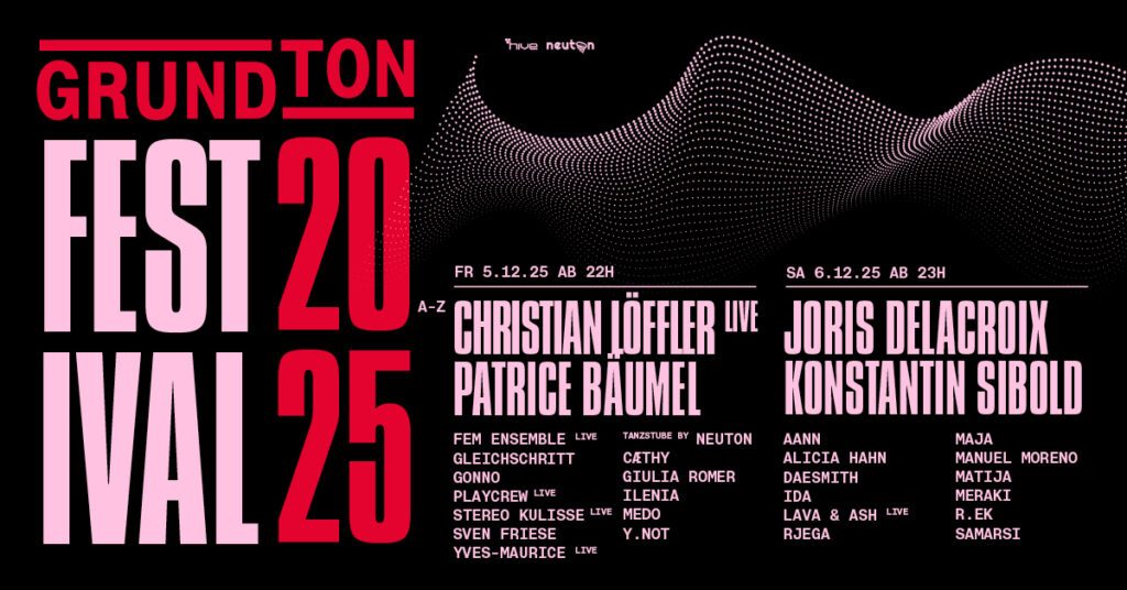 Grundton Festival, die zweite Nacht. Abermals besetzt das Label, welches das Hive seit dessen Anfängen begleitet, ein volles, ganzes und euphorisches Wochenende. Zwei Tage bis zum Kragen voller guter Musik und mit Glücksmomenten, die durch den garstigen November helfen. Mit Joris Delacroix: Der französische Meister steht für melodischen und atmosphärischen Techno und House und releast unter anderem auf InFiné. Konstantin Sibold wiederum ist die Vielseitigkeit in Person, geprägt von einer beeindruckenden Offenheit – Ob House, ob Acid, ob Techno, ob Indie … Gefällt’s, wird’s eingeflochen und das meisterhaft. Alicia Hahn ist erst seit ca. 2021 aktiv, hat aber in dieser kurzen Zeit eine stattliche Fanbase aufbauen können. Ethereal Melodien, unorthodoxe Percussion und innovative und stilsicher platzierte Synth-Sprenkel sind ihr Markenzeichen. AANN, Meraki, Rjega, Ida. R.EK, Matija, Manuel Moreno, samarsi, MaJa, Daesmith und Lava & Ash (live) vervollständigen das Grundton-Vergnügen.