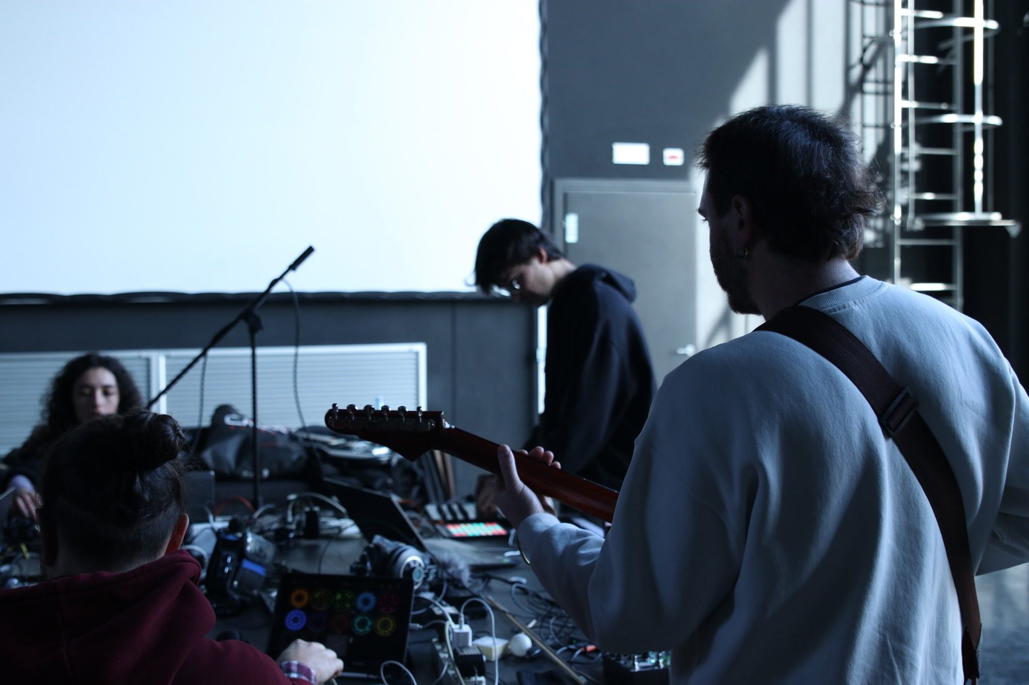 l collettivo Soniche 2025 è formato da Tobia Bondesan (sax ed elettronica), Milena Punzi (violoncello ed elettronica), Simone Grande (chitarra, elettronica e computer), Caterina Dufì (voce ed elettronica) e Nicola Moretti (chitarra ed elettronica): il progetto indaga le possibilità dell’attesa e della permanenza nel suono, del modo in cui i suoni sostano, si incontrano e generano nuove forme attraverso la costruzione di tessiture di lunga durata. L’ensemble lavora con strumenti acustici processati elettronicamente, creando paesaggi sonori dove convivono gesto strumentale, sintesi e manipolazione del suono.
