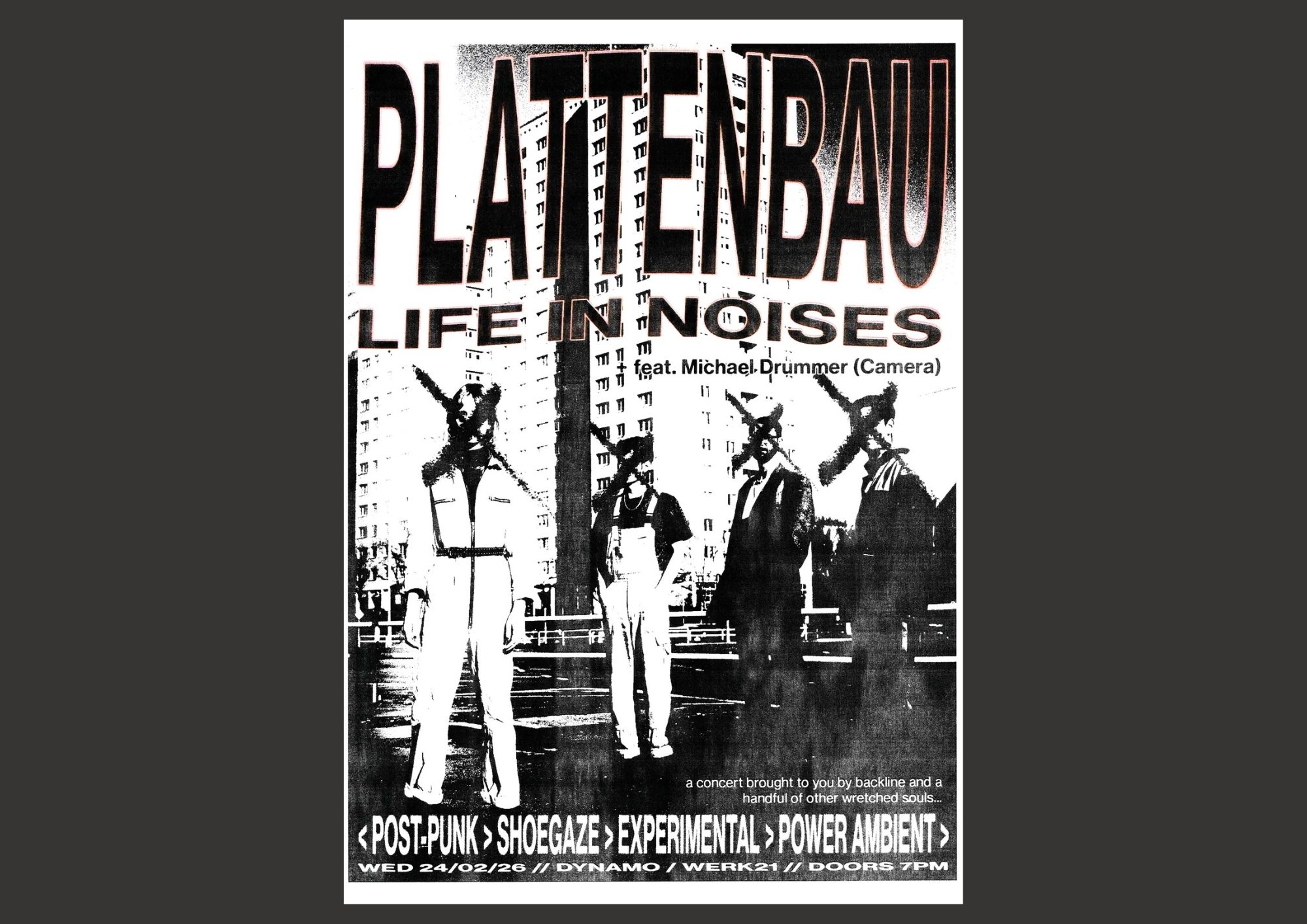 Plattenbau (commie block in German) is an international Berlin-based foursome that fuses elements of post-punk, noise rock and wave into a dark and intense potion. Their sound blends robotic drums, gothy basslines, mystical guitars and paranoid synths into a mood akin to a 90s VHS horror soundtrack, tied together with deep, brooding vocals. The result is a sonic experience that feels both chaotic and meticulously crafted, on brand with their slogan “Tight, loose and evil”. Having recently released their latest full-length album, “Cursed”, they’re once again cruising Europe and setting a trail of destruction wherever they go.