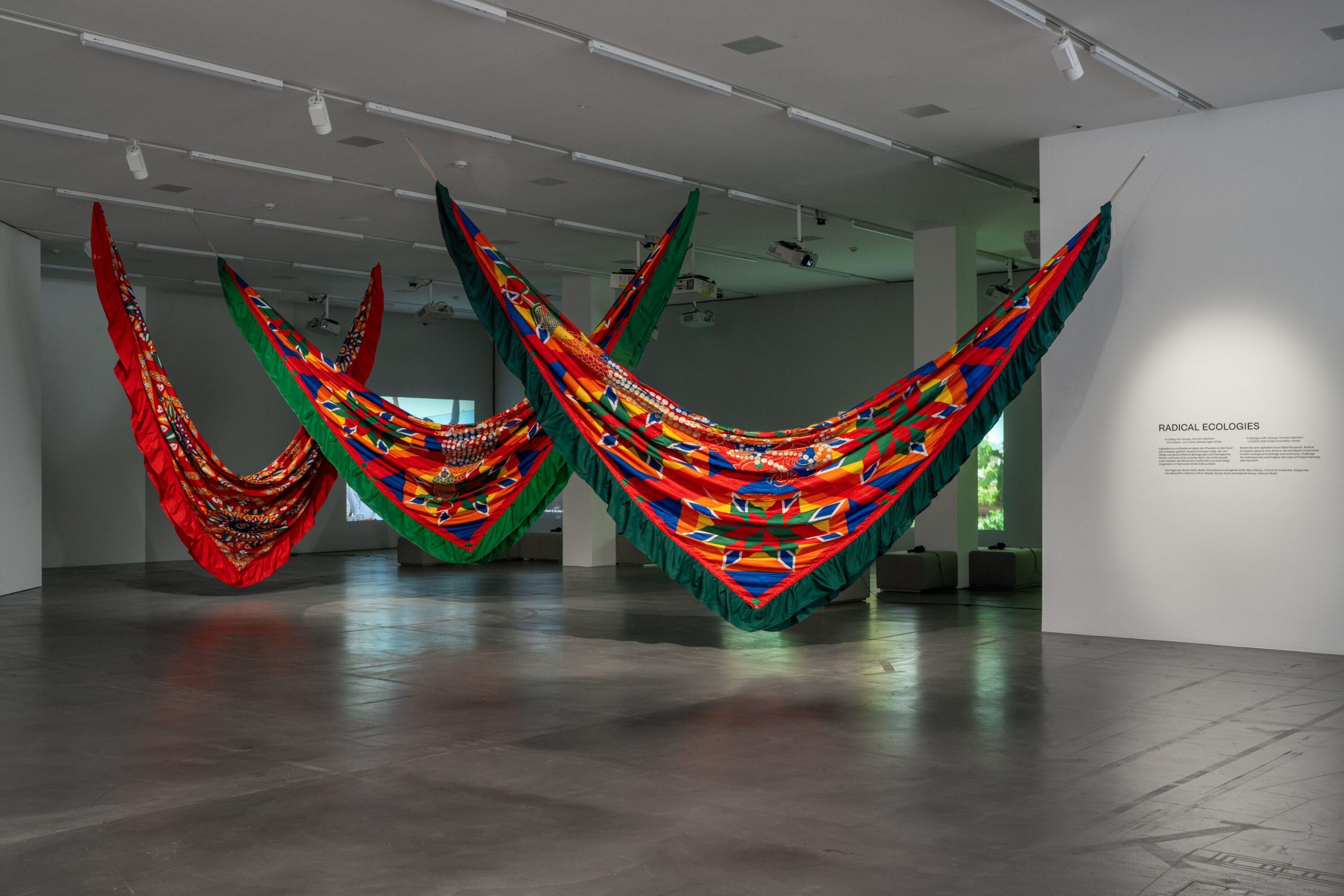 Die Ausstellung begegnet der brüchigen Gegenwart mit offenen Raumstrukturen. Ausgangpunkt ist das Shamiana, ein provisorisches, leicht aufzuspannendes Zeltdach, das im südasiatischen Raum eine wichtige Rolle im Alltag einnimmt. Unter einem Shamiana wird gegessen, gefeiert und getrauert – und man schliesst sich zum Protest zusammen.
