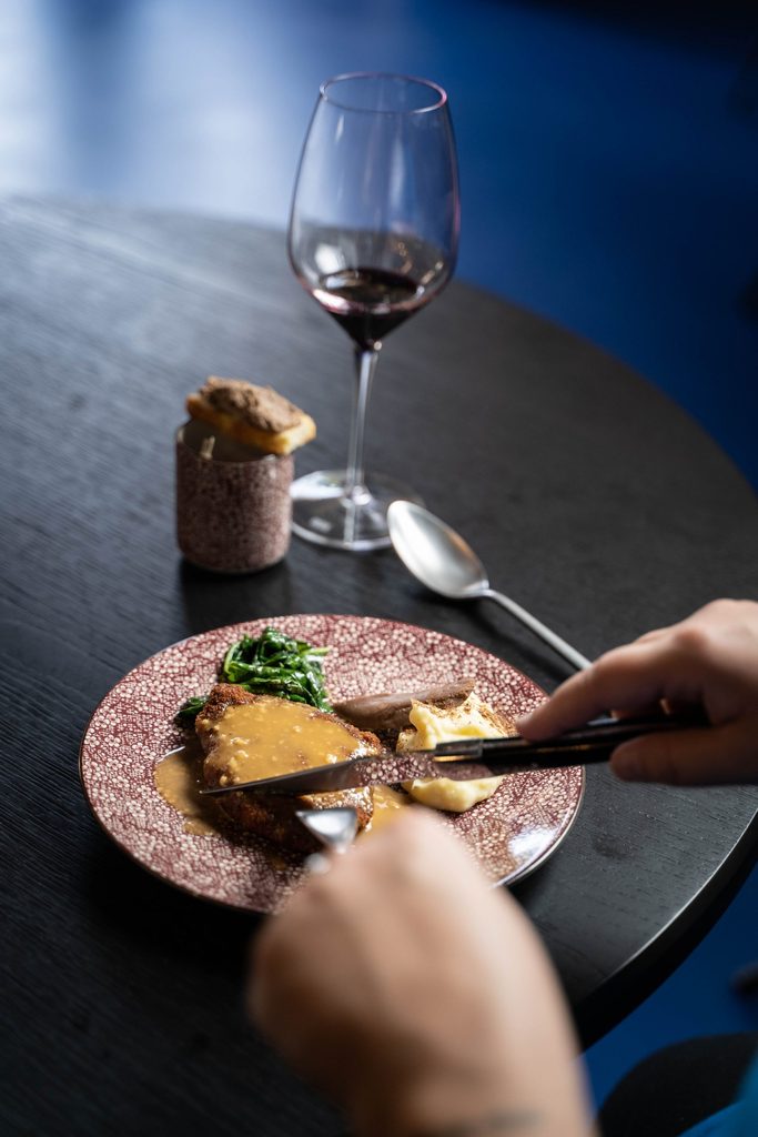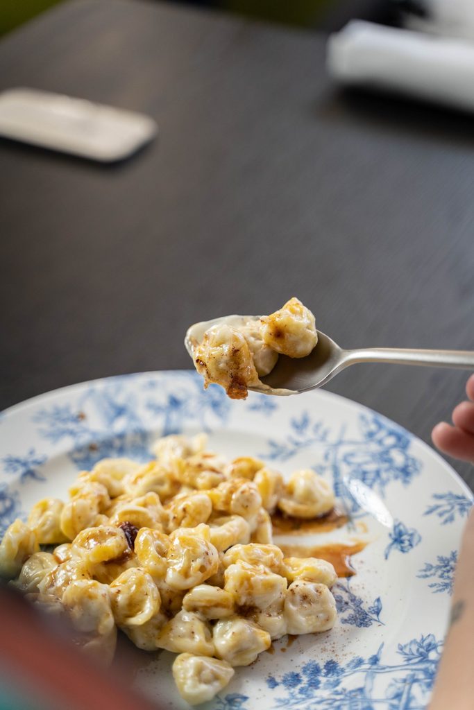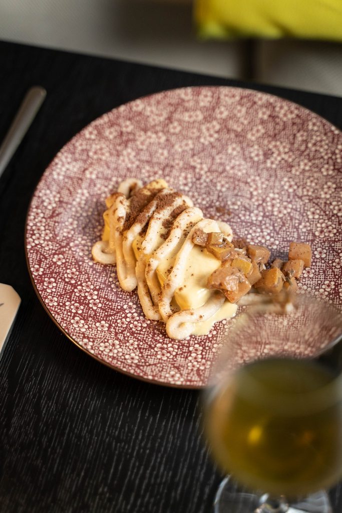 Riguardo alla nostra esperienza degustativa: indimenticabile il battuto di pecora (€ 15) con topinambur, datteri, teriyaki e santoreggia; spaziale il risotto alle lumache (€ 18) con fondo bruno al vino rosso, burro chiarificato e polvere di cavolo nero; eretici e, non solo per questo, grandiosi i tortellini (€20) con mortadella di cinghiale, lombo capriolo, salsiccia passita di cervo, comtè e noce moscata. Arrivati qui eravamo già sazi, ma non potevamo non provare anche il petto di piccione fritto (€ 26) con purè di patate e filetto marinato e la buonissima zucca cotta a bassa cottura (€21) con scalogno, mostarda di zucca cotta per 30 ore, sciroppo di senape, crumble di semi di zucca e amaretto e besciamella alla senape. Colpo di grazia con il babà bagnato di gin con crema di bitter e riduzione di vermut (€ 8).