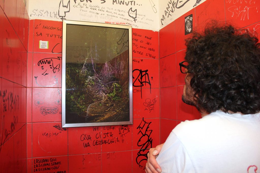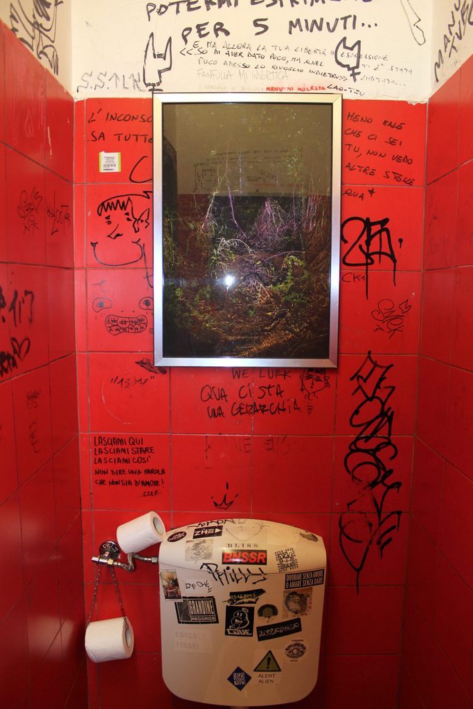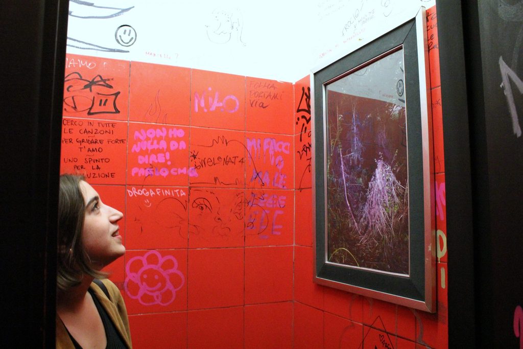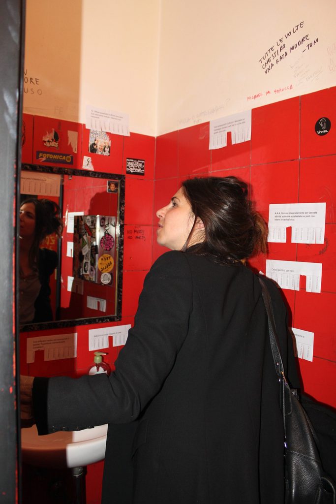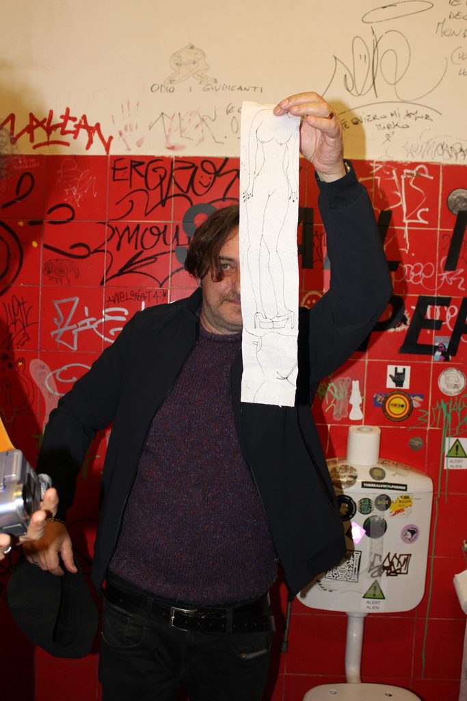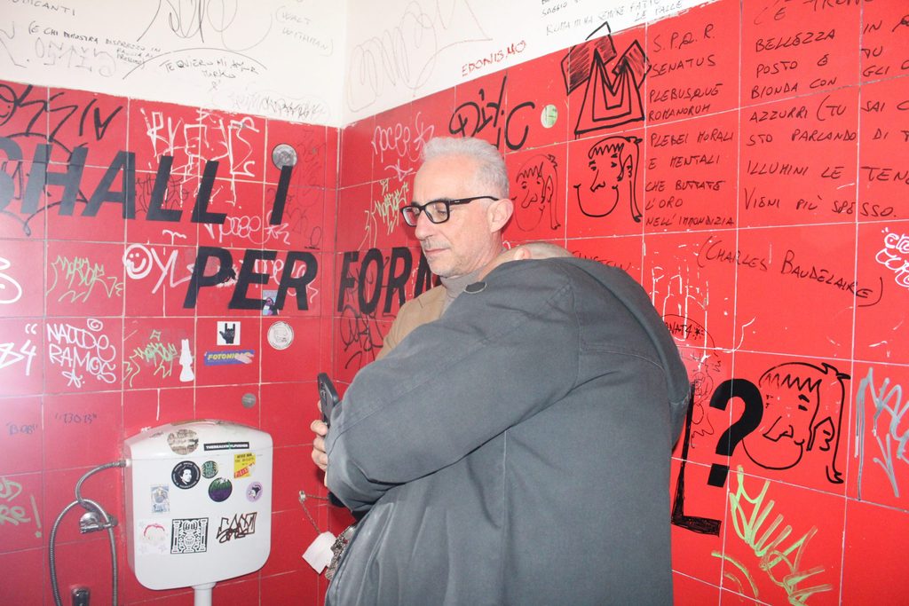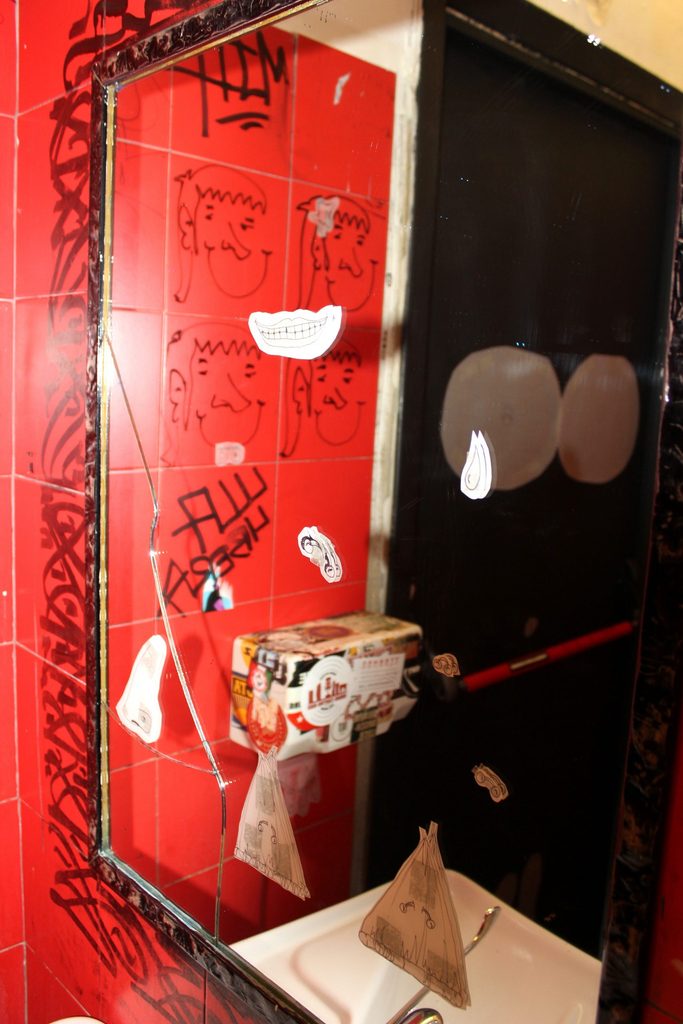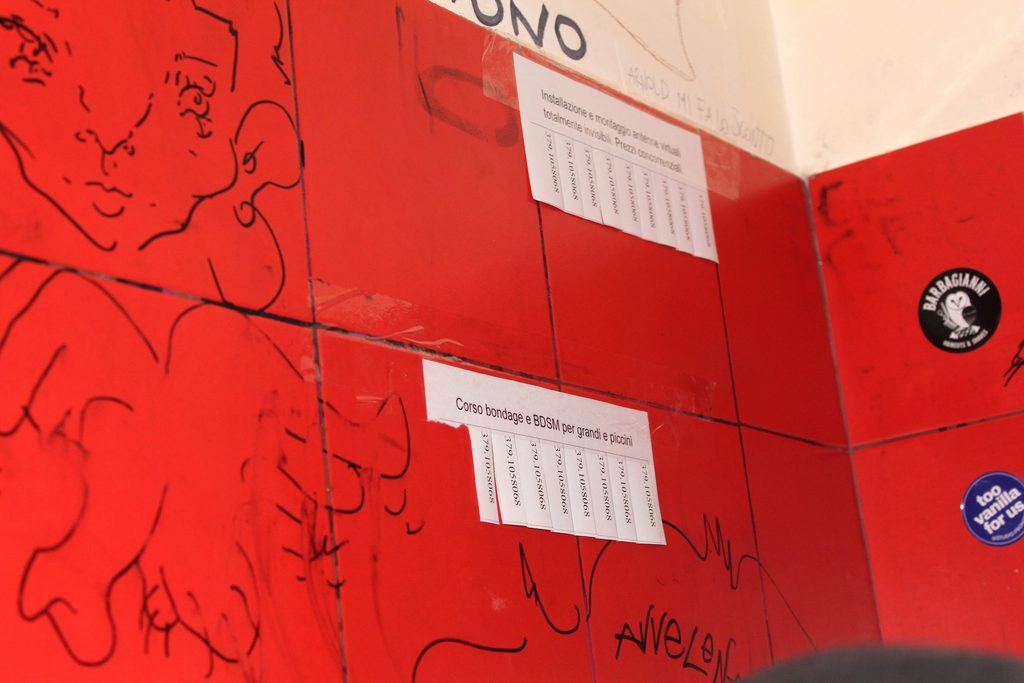 L’autore abita l’antibagno della toilette posta a sinistra del locale, con un suo autoritratto disegnato a pennarello nero su dei fogli di carta adesiva di colore rosso ed inserti bianchi attaccato sulla porta interna del bagno. ;entre sulla prima porta del antibagno accompagna l’opera i versi di Anonimo Romano: una lode agli ardori, ai facili amplessi consumati nei bagni del Fanfulla.