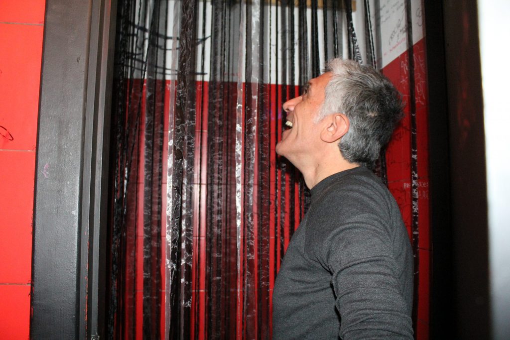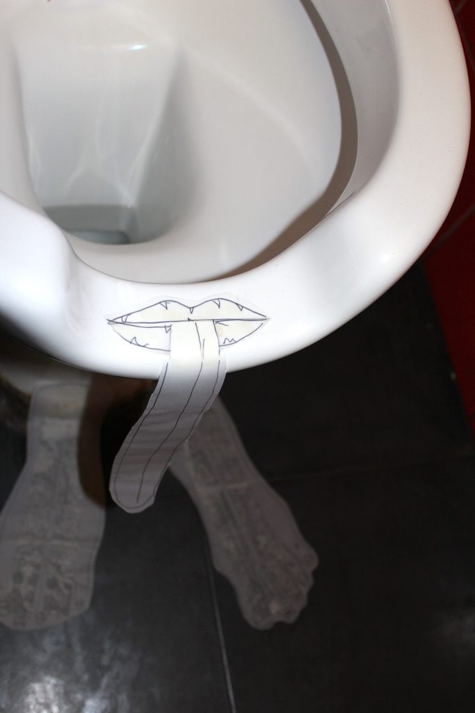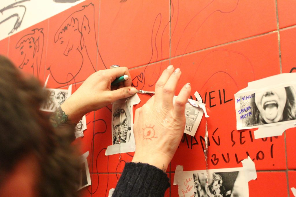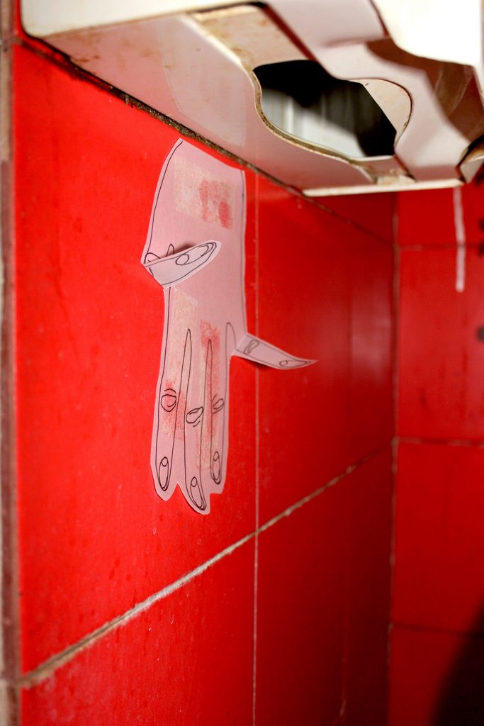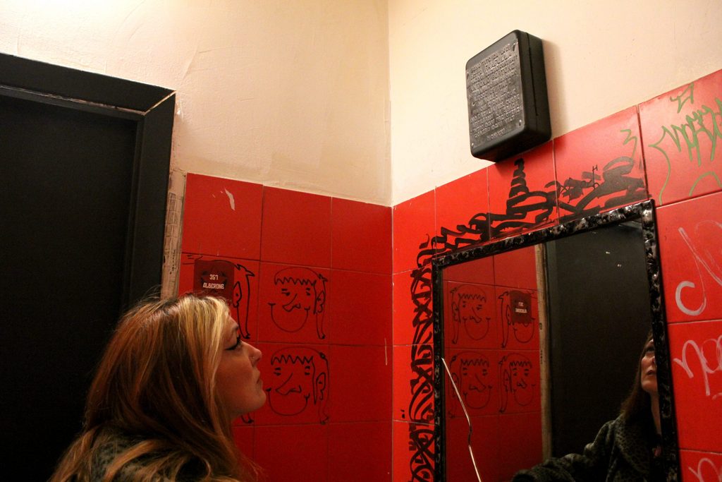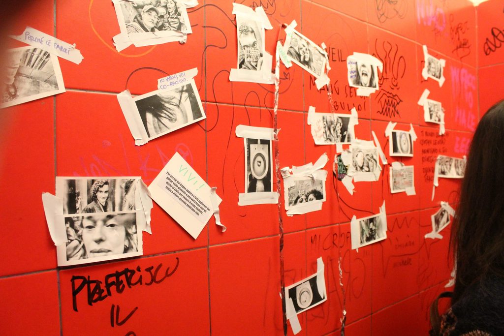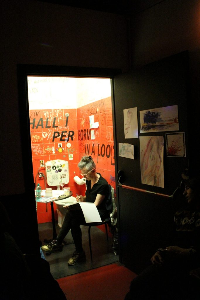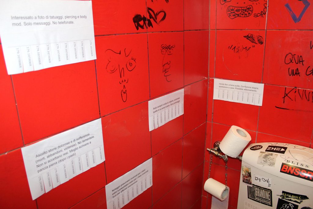 L’autore abita l’antibagno della toilette posta a sinistra del locale, con un suo autoritratto disegnato a pennarello nero su dei fogli di carta adesiva di colore rosso ed inserti bianchi attaccato sulla porta interna del bagno. ;entre sulla prima porta del antibagno accompagna l’opera i versi di Anonimo Romano: una lode agli ardori, ai facili amplessi consumati nei bagni del Fanfulla.