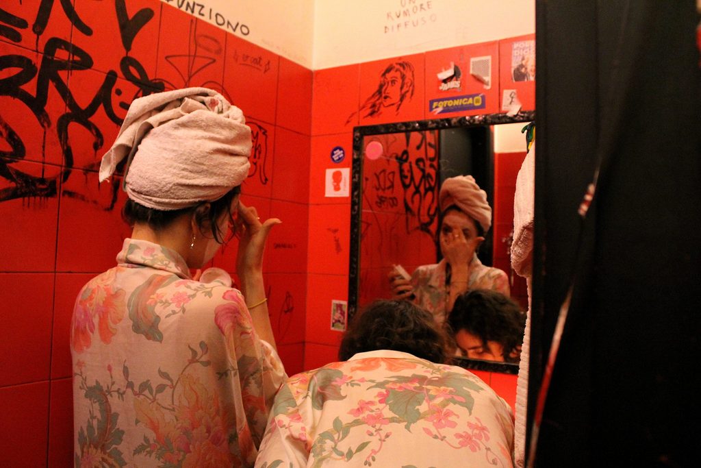 *artistə rispondono alle domande dal cellulare, mentre si trovano in un bagno