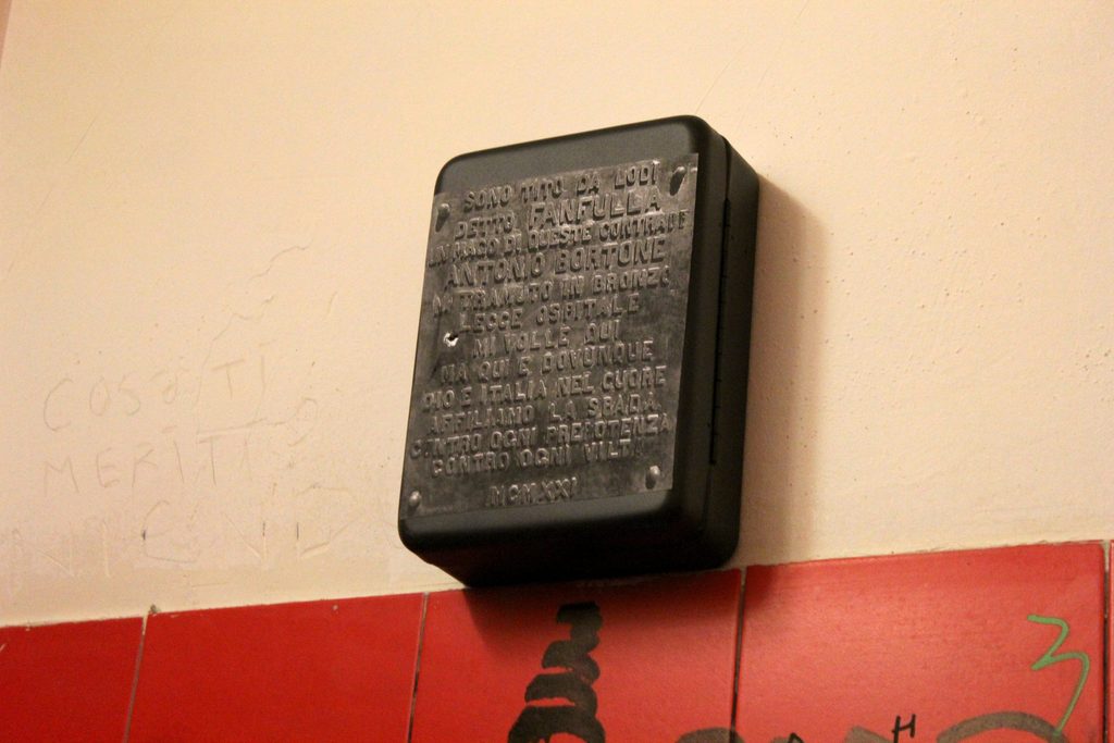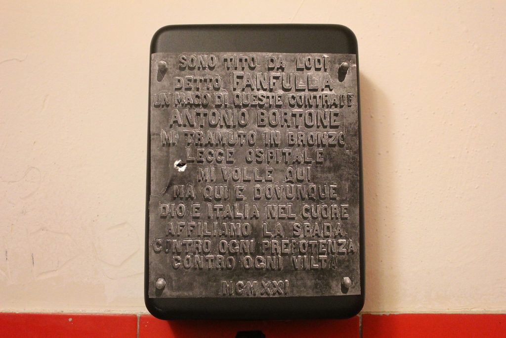 Da un piccola teca blindata, posizionata sulla parete del bagno del Fanfulla, un piccolo altoparlante trasmette una canzone goliardica dedicata al condottiero Fanfulla da Lodi, in cui si narra di una sua avventura con una prostituta che, non debitamente retribuita si vendicherebbe, contagiandolo con una malattia infettiva.