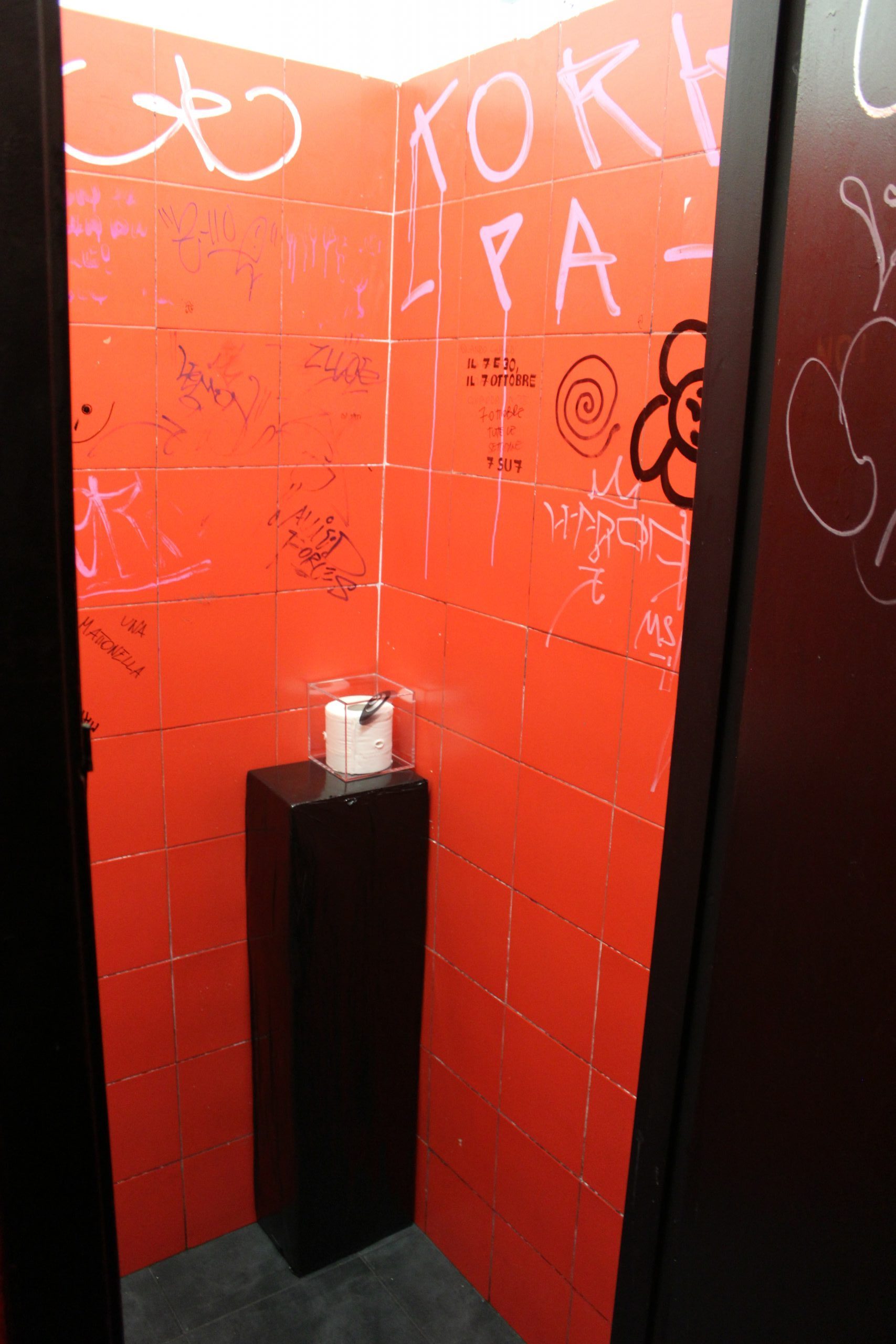 L’autore abita l’antibagno della toilette posta a sinistra del locale, con un suo autoritratto disegnato a pennarello nero su dei fogli di carta adesiva di colore rosso ed inserti bianchi attaccato sulla porta interna del bagno. ;entre sulla prima porta del antibagno accompagna l’opera i versi di Anonimo Romano: una lode agli ardori, ai facili amplessi consumati nei bagni del Fanfulla.