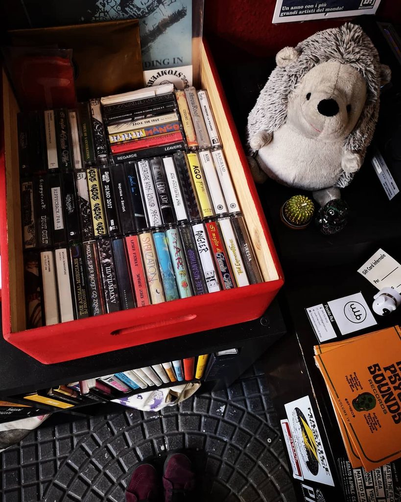 Penso volesse pure trovarmi una sorta di sistemazione: non le piaceva proprio l’idea di sapermi chiusa in una fabbrichetta nove ore al giorno dal lunedì al venerdì, a volte pure il sabato mattina. Ovviamente non c’era bisogno di convincermi. Anche se un po’ meno romantica, ero sulla sua stessa lunghezza d’onda: battagliera contro i grandi mulini a vento di Amazon. E poi mi ero rotta il cazzo delle magliette e dell’odore di colle e solventi vari. Inizialmente doveva esserci con noi anche Antonio Olivieri dell’etichetta Angst per cui Claudia usciva col progetto Cassandra. Si sarebbe dovuto occupare lui di tutto il fronte digitale: sito, shop, grafiche, comunicazione, delle spedizioni degli ordini e di stare in negozio la domenica pomeriggio; credo che Claudia volesse in qualche modo dare una possibilità anche a lui di emanciparsi e fare di mestiere quello che, d’altronde, già faceva per passione con l’etichetta. Purtroppo la cosa non funzionò e dopo un paio di mesi il rapporto lavorativo, ma pure di amicizia, finì. Fin dall’inizio ci siamo sempre state io e Claudia e così siamo rimaste, bestemmiando sempre perché la parte degli ordini online è sempre stata una rottura di cazzo, ma abbiamo imparato a fare pure quello.