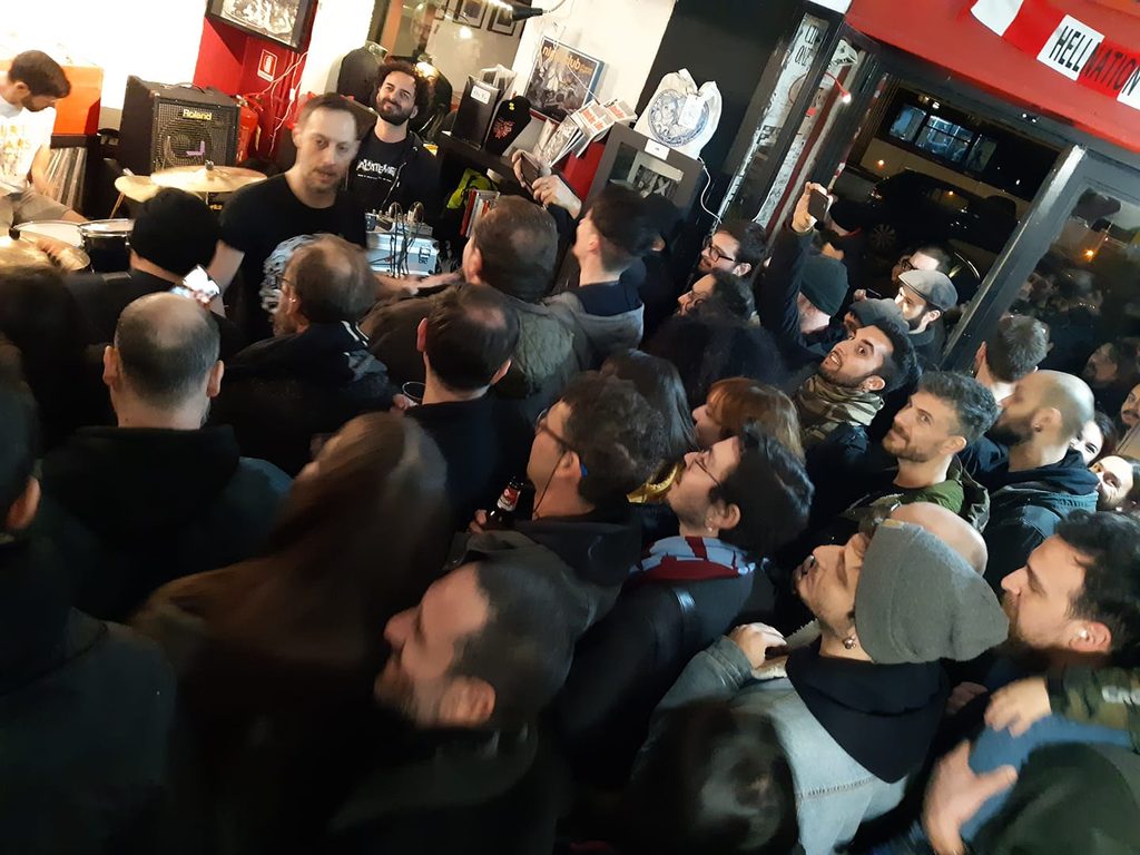 Gli eventi da Inferno sono nati principalmente perché Claudia senza organizzare concerti non ci poteva stare, e perché toccava far venire la gente in negozio a spendere soldi! Bello tutto, ma noi dovevamo pur campare. O meglio, io – regolarmente assunta e stipendiata. Claudia non è mai rientrata delle spese sostenute per rilevare l’attività prima e comprare le mura poi, credo dopo l’estate del 2019. Inaugurammo nel weekend dell’Epifania 2018 con tre giorni di festa, abbiamo poi sempre festeggiato il nostro compleanno. Quelli sono stati senz’altro gli eventi più eclatanti. Se ve lo state chiedendo, sì, gli Inferno hanno suonato da Inferno, proprio in occasione del secondo compleanno nel gennaio 2020. Il loro live fu epico: il negozio scoppiava, il bassista Daniele e Valerio Hombre Lobo, chitarrista, suonarono sul marciapiede di via Nomentena. Chi non è venuto quella volta si è perso qualcosa di incredibile. In verità io ho amato tutti i concerti che abbiamo fatto, anche se qualcuno lo ricordo meno. Nell’autunno 2019, in occasione dell’inaugurazione di due mostre – di Manuel Cossu prima e Riccardo Bucchioni poi – suonarono rispettivamente Arabian Tower (il mio gruppo) e Twister. Furono concerti davvero azzeccati per le mostre esposte, entrambe curate da Rossana Calbi, che si è occupata di tutte le mostre che abbiamo ospitato ed è stata una nostra collaboratrice. C’era quasi sempre qualcosa alle pareti: lo avevamo pensato sin da subito perché, vabbè, io a tempo perso potrei pure essere curatrice d’arte, ho un progetto ancora in piedi che non ho mai fatto in tempo a esporre da Inferno. Si chiama WOODoo, e ha dato nome a quello che avremmo poi dovuto fare se il negozio fosse rimasto aperto – tra poco ci ritornerò su questa cosa. Poi ricordo bene gli IRA, per il compleanno 2020, che sono un gruppo hardcore vecchio stile tipo Indigesti/Negazione ai quali io e Cla abbiamo sempre voluto tanto bene. I Six Feet Tall di Perugia nel settembre 2020, con tutte le restrizioni covid del caso. Claudia ebbe la pensata di mettere il gruppo in vetrina: potevamo spalancarla tutta e far stare il pubblico in strada, all’aperto, dove ci si poteva comunque radunare purché con distanziamento e noi non occupavamo suolo pubblico. Genio del male!