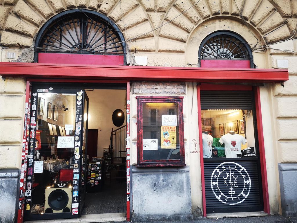Credo che Robertò avesse scelto quel posto perché quando aprì, negli anni Novanta, era ancora un punto abbastanza centrale in città. È vicino alla stazione Termini e poi nei dintorni una volta c’erano diverse gallerie d’arte, come Mondo Bizzarro per esempio. Adesso via Nomentana è solo un passaggio a scorrimento veloce: è più nelle vie interne che c’è vita. A via Alessandria c’è anche il mercato e altre attività commerciali “normali”, oltre a quelle più da ricchi, tipo una specie di gioielleria del cibo confezionato che aveva aperto e che secondo me è durata meno di un anno. Sicuramente una grossa rivoluzione fu l’apertura del bangladino accanto a Hellnation, ormai diversi anni fa. Perfetto alleato nelle giornate degli eventi. In generale, è un quartiere che vive tanto di giorno, con gli impiegati. D’inverno, dopo il Covid, avevamo iniziato a chiudere alle 19:00 perché tanto non girava più nessuno. Bar e ristoranti si trovano più giù, intorno a viale Regina Margherita, piazza Buenos Aires. Sicuramente il Covid ha cambiato tanto il modo di vivere i quartieri e le aggregazioni. Noi abbiamo perso un sacco di clienti del ministero e degli uffici, buona parte di loro è rimasta in smart working fino a non so quando. Se già la gente aveva il culo pesante per spostarsi da Roma Est, figurati con le restrizioni. Tutti arroccati tra Casilina e Prenestina, mai superare i bastioni di Porta Maggiore! Questa cosa ci mandava fuori di testa, a me e a Claudia. Facevamo dei dj set il sabato e li trasmettevamo in streaming, un po’ per animare la situazione, un po’ per farci compagnia. Per noi era un modo per stare vicino alle persone, visto che non si potevano fare concerti e i bar chiudevano alle 18:00. Eppure la gente non si spostava. Quando ho immaginato di riaprire il negozio ho pensato subito a Torpignattara infatti. Porta Pia è ben servita dai mezzi, ma parcheggiare è una croce, ci abita gente agiata, ma non interessata a quel che un negozio indipendente può offrire, e per quanto ci sia volontà di fare rete con le altre attività commerciali, sono tutte un po’ “vecchia maniera” e borghesi per essere effettivamente utili. A proposito di borghesi, concludo dicendoti che ogni volta che abbiamo organizzato concerti Claudia faceva sempre questo scongiuro: “Speriamo che non chiamano le guardie, speriamo che non mi arrestano”. Alla fine le guardie le hanno chiamate veramente, quando lei non c’era più, al penultimo evento che ho fatto prima di chiudere aprile 2021. Porc… I vigili ci avevano puntato da un anno, per far rimuovere il cassone della tenda che avevamo all’esterno e la piccola bacheca tra le due vetrine, perché l’ombra che proiettavano occupava suolo pubblico (sic!). Coi due mesi di chiusura evidentemente non avevano fatto multe, quindi si rifacevano su questi cavilli. Le stesse vigilesse sono tornate anche quando è morta Claudia. Non gli risultava morta. Incredibili. Quindi, capirai, quando qualche vecchio fobico ha visto il cataclisma di gente che veniva agli eventi di chiusura, non gli sarà parso vero poter chiamare le guardie. Ecco com’è il quartiere: borghese e ora pure incattivito. Non ci torno da quasi un anno in negozio, ci sono passata davanti qualche mese fa e un po’ di magone m’è venuto. Non mi va di riandarci, del resto quel quartiere senza Inferno non ha più niente da dirmi. Ma la gelateria di Leonardo è sempre bona».