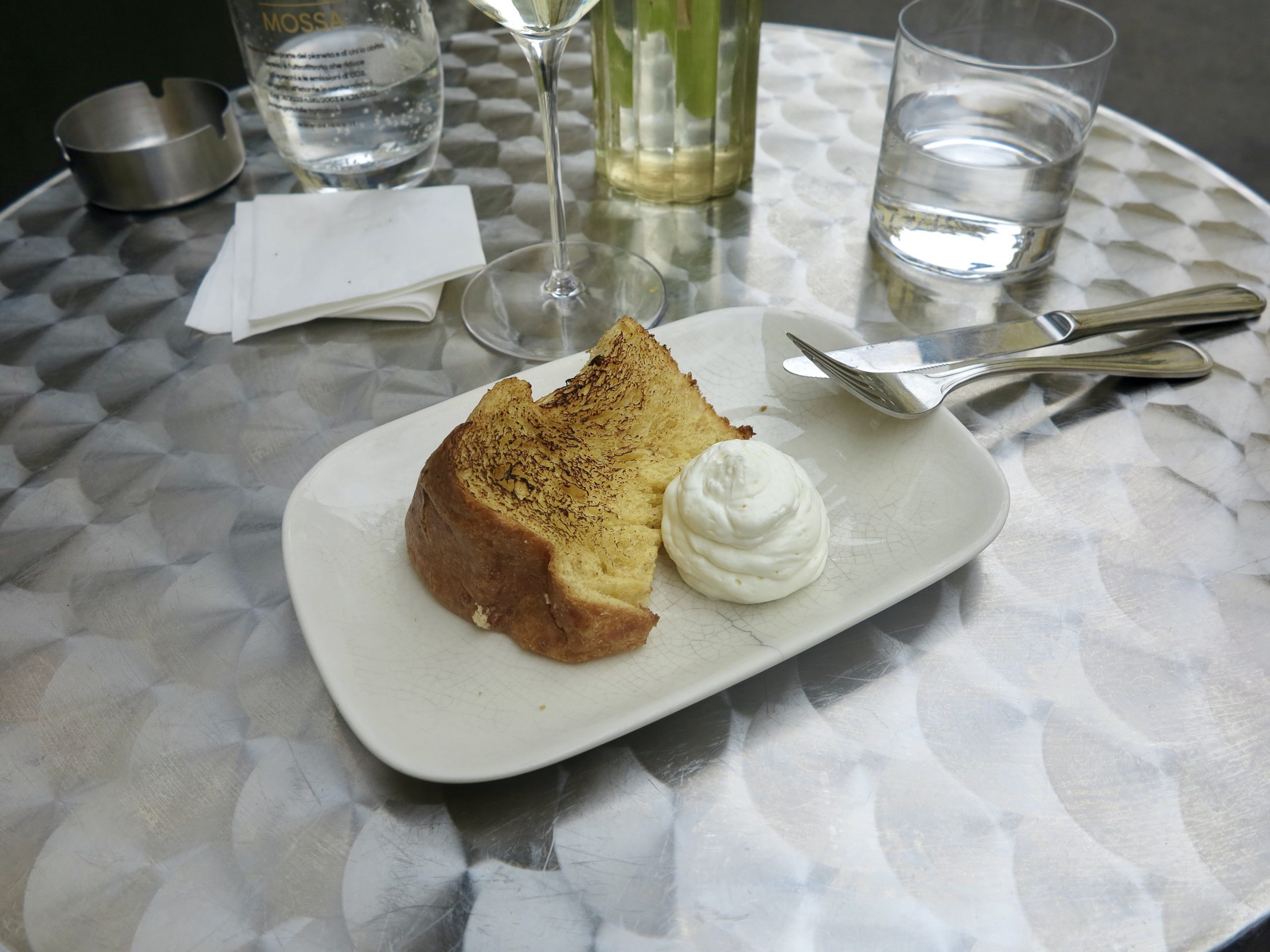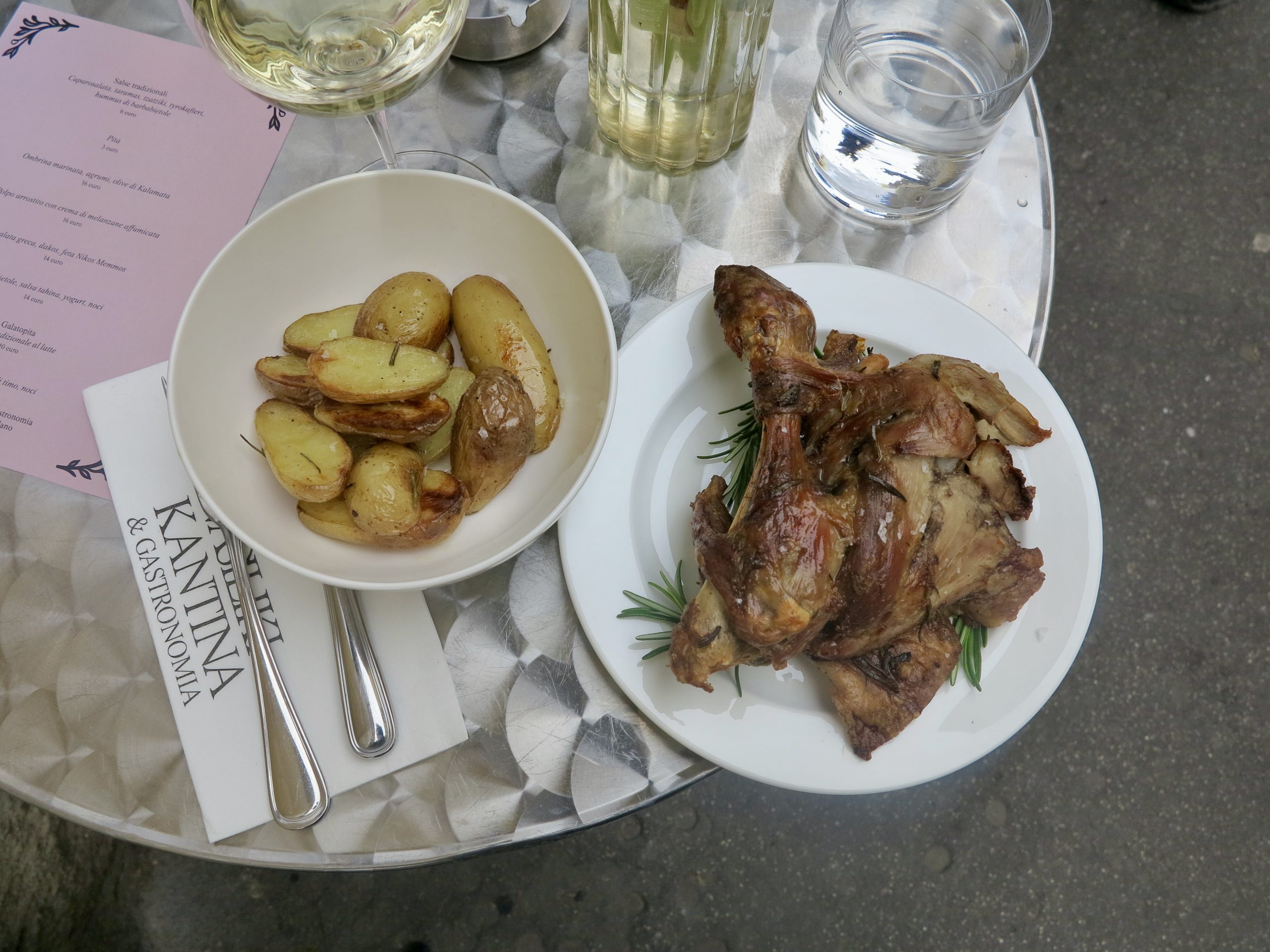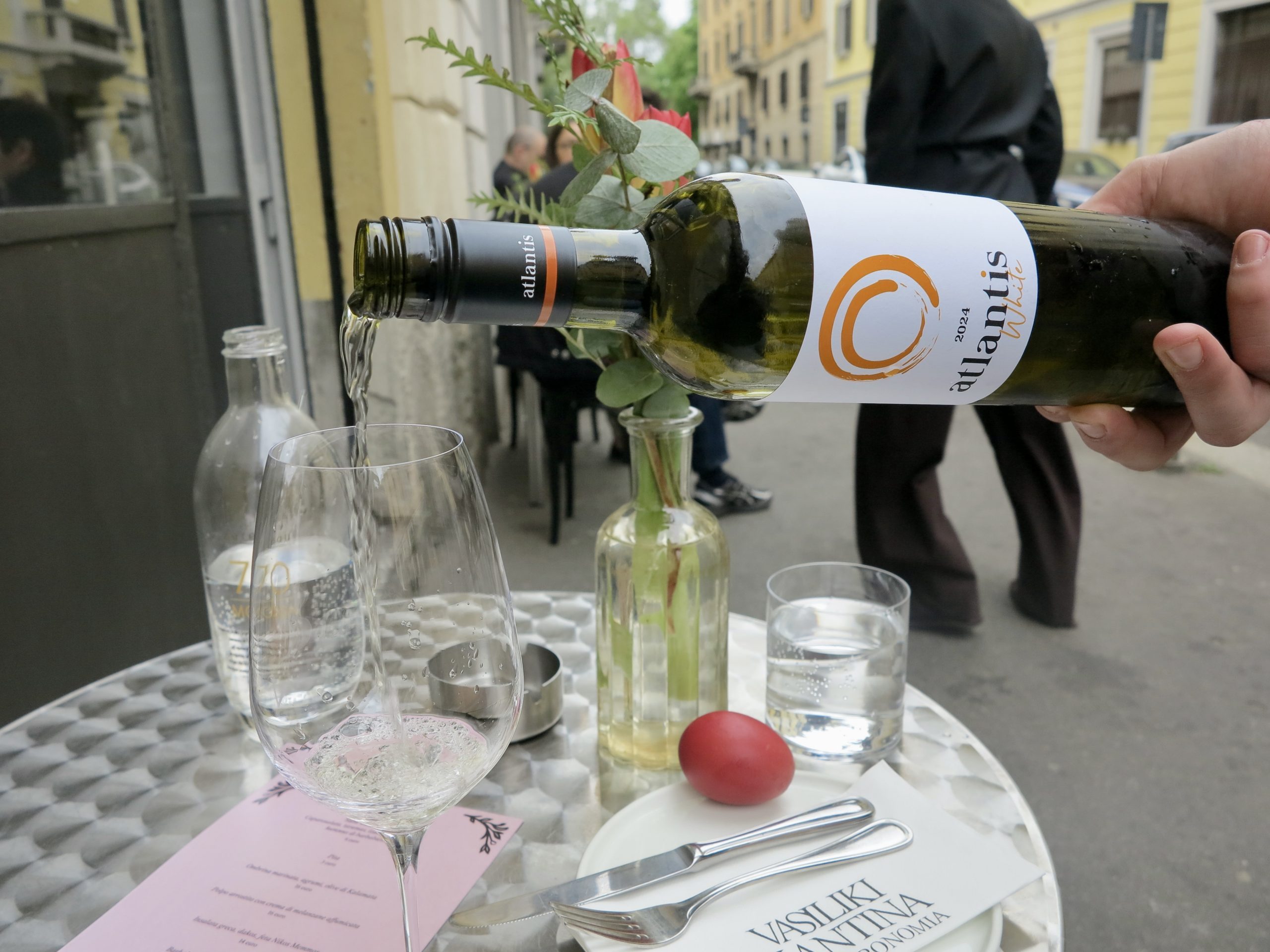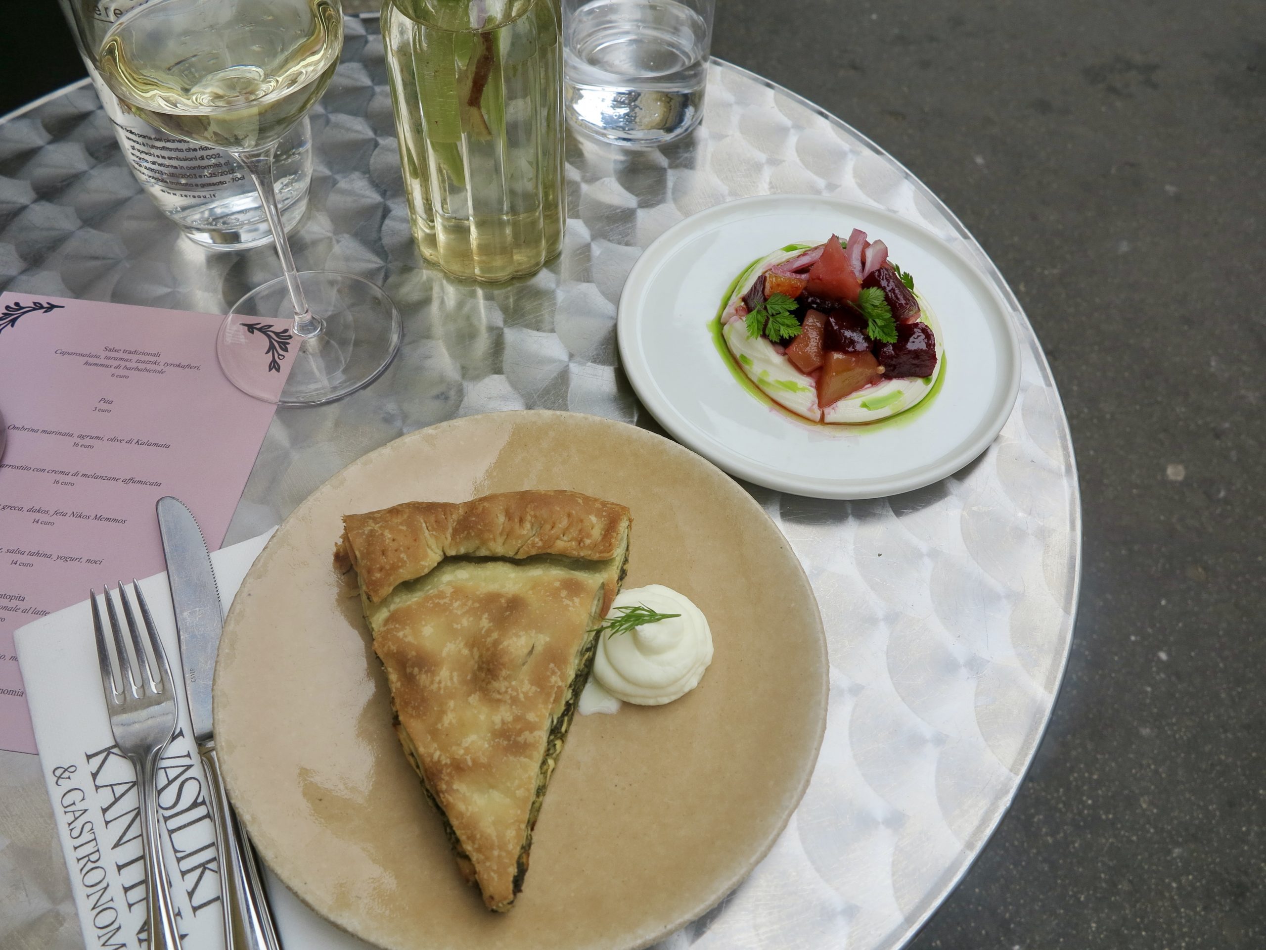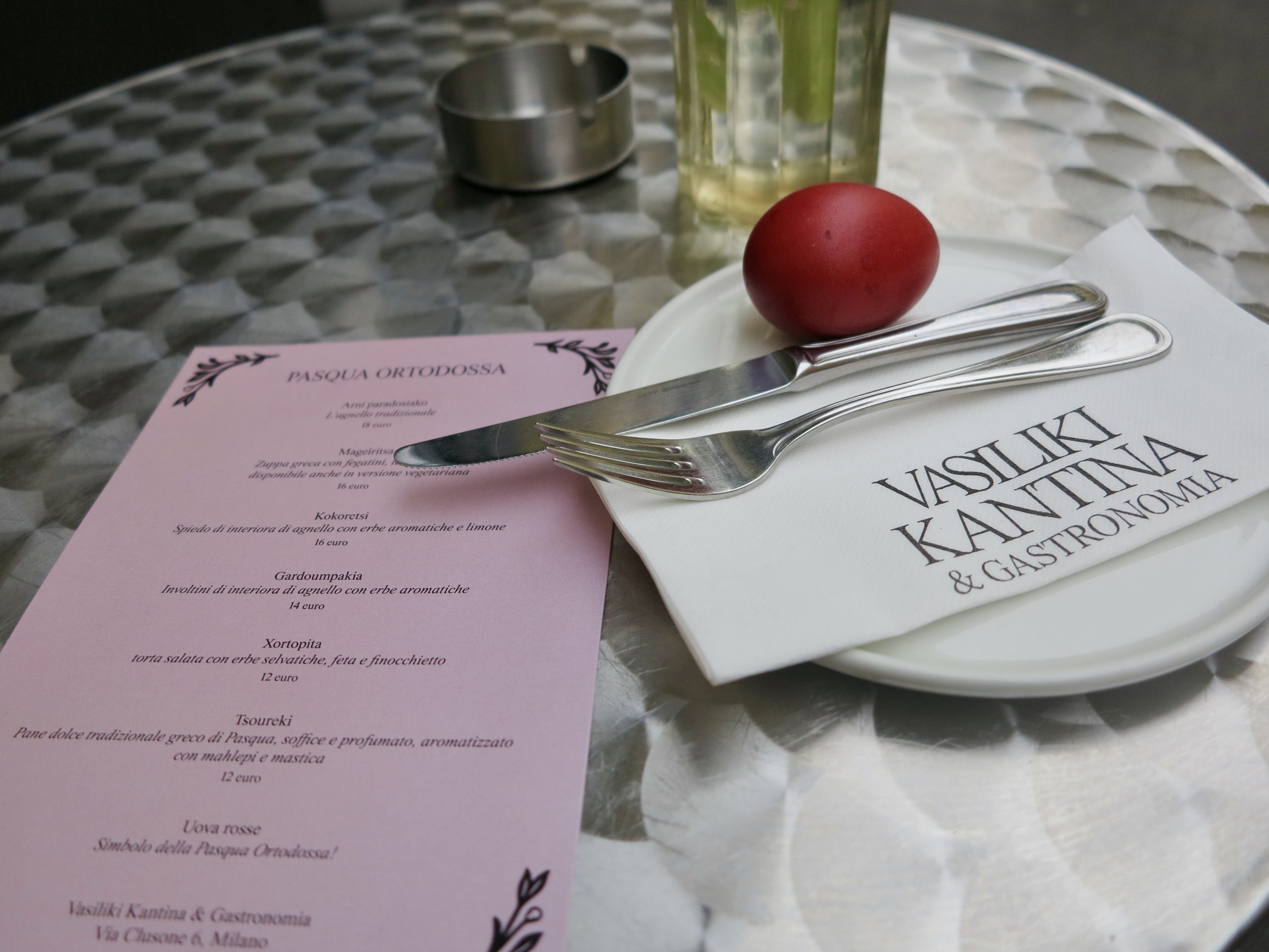 Il menu di Pasqua prevedeva l’Arni Paradosiako, l’agnello con le patate, la Mageiritsa, una zuppa greca con fegatini, lattuga e aneto, e il Kokoretsi, uno spiedo di interiora di agnello con erbe aromatiche e limone. La Xortopita, una torta salata con erbe selvatiche, feta e finocchietto, mi ha fatto innamorare dei sapori ellenici, mentre lo Tsoureki mi ha fatto letteralmente lacrimare. Ho accompagnato il tutto con un vino di Santorini di uve Assyrtiko: minerale, secco e leggero.