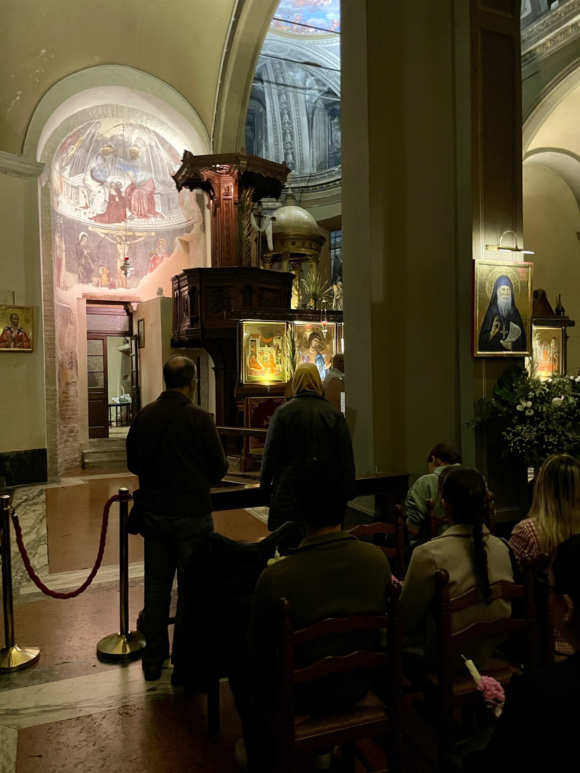 Il sabato ho assistito alla notte della “prima resurrezione” di Gesù che, secondo gli ortodossi, risorge prima di sabato non per andare in Paradiso, bensì per scendere nell’oltretomba a salvare le anime dei non credenti. La prima resurrezione è stata accompagnata da una notte di canti bizantini di un coro che se da una parte rendeva tutto molto serio, dall’altra aveva in sé quell’aura magnetica degli anacoreti, dell’Impero Bizantino, della storia del mondo.