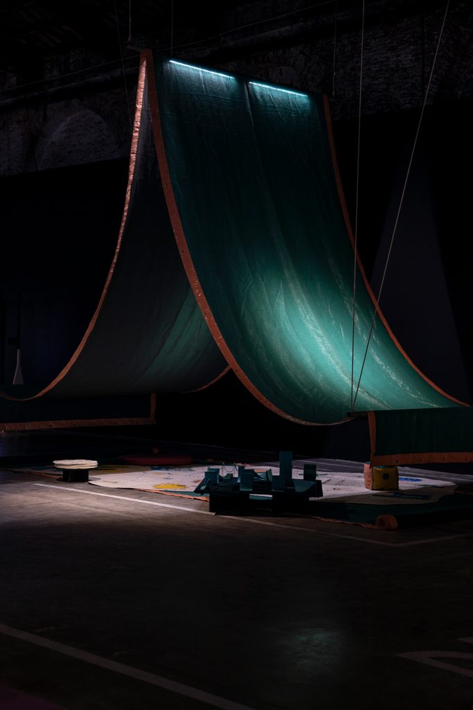 Cosa fare dunque? Qual è la giusta reazione? Quale la risposta necessaria di chi questo mondo lo abita? Il Padiglione della Gran Bretagna Dancing Before the Moon ci suggerisce di sdraiarci verso l’alto per ammirare i riti che la diaspora ha portato in Inghilterra, seguendo le parole di James Baldwin: «C’è chi desidera colonizzare la luna e chi danza di fronte a lei, come se fosse una vecchia amica». Come non apprezzare poi l’intento della Francia, quando nel suo Padiglione un globo specchiato si trasforma in teatro: this is were we live, this is where we dance, this is where we die, ed esplode in un ballo tanto sfacciato quanto straziante. La danza si rende espressione della diversità di ognuno e intanto ogni spettatore si sente scrutato e riflesso negli specchi che circondano il pianeta-teatro: you are all beautifull. È evidente che qui gli artisti cercano una nuova liturgia, un nuovo luogo dove condividere gli stessi valori, dove lo spazio diventa politico in senso etico ed estetico in senso politico. Arriviamo alle Tese delle Vergini, ed ecco finalmente il Padiglione Italia: Spaziale – Ognuno appartiene a tutti gli altri. È il lavoro dei Fosbury Architecture che, con le parole di Nicola Campri, membro del collettivo under 35, ci racconta l’importanza di attivare dei processi nel territorio e allo stesso tempo di rappresentarli con la giusta chiave epistemologica. Qui l’emozione gioca un ruolo fondamentale tra le sfumature di azzurro della tenda che nasconde l’entrata, oltre la quale si trovano sparsi suoni, coni di sale, absidi plastiche e case tappeto. È un rito di sintesi corale: nove installazioni site-specific sparse in tutta Italia e riportate simbolicamente qui. Questi rapporti tra pratiche, persone e territori riacciuffano con tutti i sensi il carattere di un luogo, un territorio comune a diverse istanze, diversi luoghi che se opportunamente coltivato, proprio come il suolo, diventa capace di assumere un senso, un’urgenza e una pratica condivisa nel tempo.