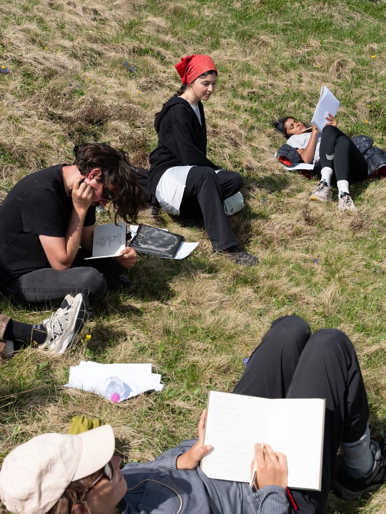 Ad arrivare siamo in tredici da tutto il mondo e io mi trovo lì, rannicchiata con loro. Alla base della scuola nomade c’è un gruppo di persone che non si conoscono, che per due settimane decidono di essere comunità, di stare insieme attuando delle pratiche di scambio e condivisione profonde ma mai forzate. C’è il pensiero, c’è il corpo e il sentire e poi ci sono i tutor, ovvero professionistə provenienti dalle discipline e dai territori più diversi per aprire ancora di più gli sguardi e le visioni che intercorrono tra noi e il paesaggio. Intorno ci sono i profili delle montagne, le nuvole del cielo, i fiori le rocce e i prati. Le nostre mani su di essi e i nostri respiri che ne diventano parte. Siamo insieme per sentire di più e immaginare meglio. Di quei giorni vorrei raccontare ogni cosa, ma sarebbe come imbrogliare. Ho imparato troppo e da quella roulotte sono uscite un numero infinito di persone. Quindi ho scelto una storia fatta di pensieri nomadi.