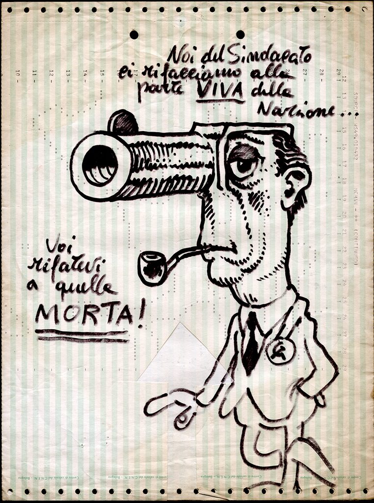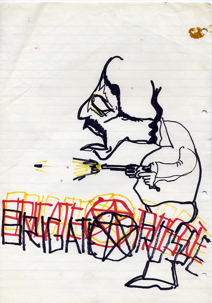 Reperto 1 è uno scavo dove viene alla luce un’inciviltà barbara e scintillante irriducibile a qualsivoglia inclusione nei canoni dell’atelier istituzionalizzato. Dalle centinaia di disegni ogni volta sbotta un’energia incredibile intatta a distanza di quasi mezzo secolo. Niente crediti, è il frutto di un lavoro collettivo forse unico al mondo “non ci sono stronzeregole nella casa occupata tutto è sospeso la fisica il tempo la logica”. L’ordine è abolito lo dimostrano filmati con fantasmi che vagano sempre sul punto di sparire e poi di riapparire.