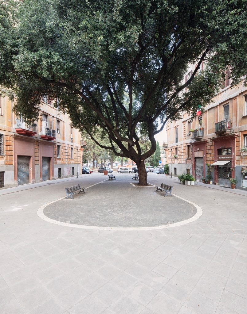 Per noi il Flaminio è davvero un quartiere molto significativo e si è rivelato essere una costante fonte di ispirazione per la nostra formazione e per la nostra educazione come architetti. I nostri luoghi del cuore qui sono quattro. Il primo è Villa Glori, uno dei primi progetti di paesaggio moderno a Roma, firmato da Raffaele De Vico, architetto di giardini e spazi pubblici a metà tra un progettista come lo intendiamo oggi e un dandy – bellissima la foto in cui è sdraiato con un fiore in bocca in mezzo a uno dei giardini romani disegnati, anticipando di sessant’anni un’altrettanto iconico ritratto dei Beatles. Poi c’è Monte Mario – sempre progettato da De Vico, che però non riuscirà a realizzarlo completamente – immaginato all’epoca come il secondo grande approdo verde di questo nuovo quartiere sui prati del Flaminio.