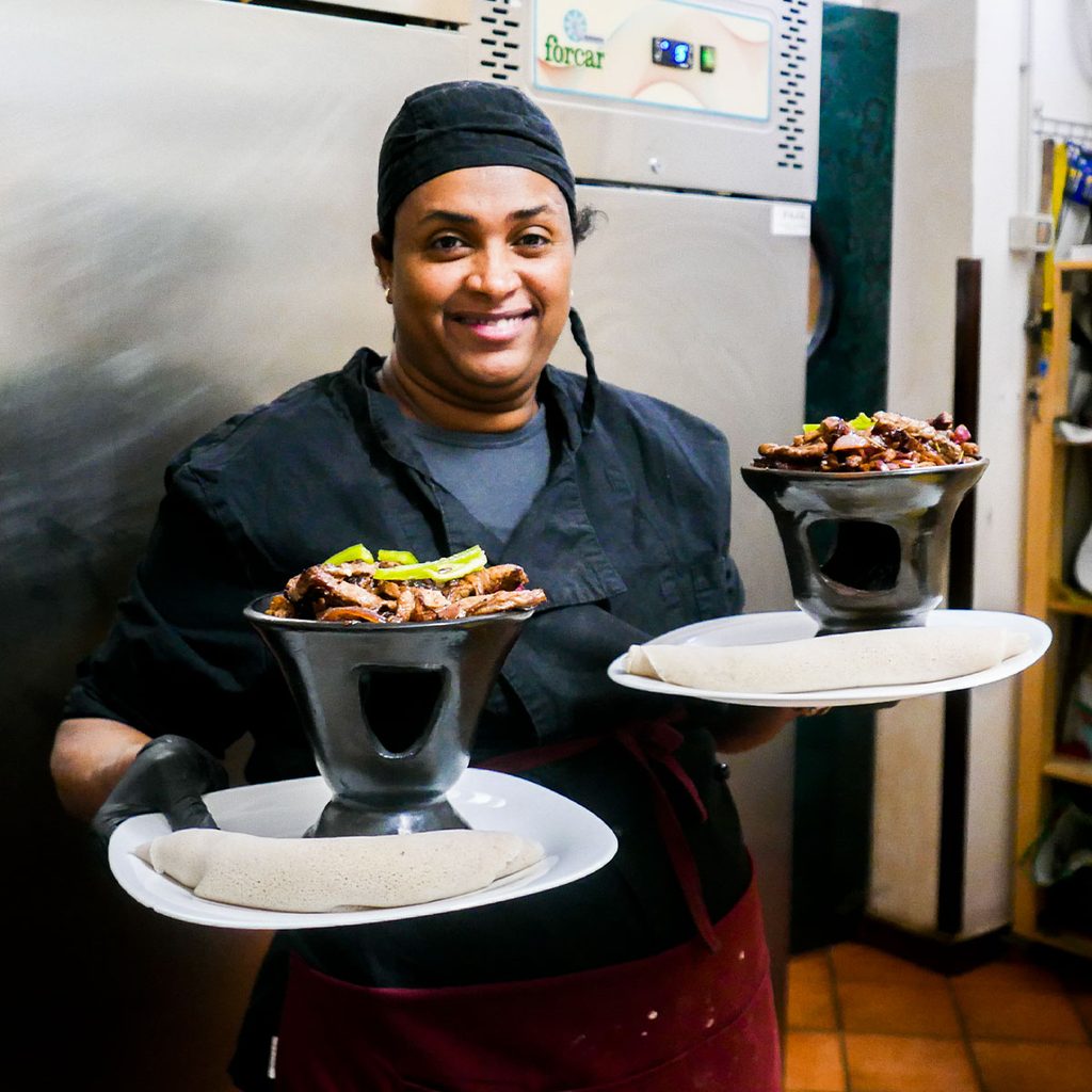 Forse perché il cibo è la forma più immediata di conoscenza, e la tavola il luogo in cui avvengono continue confidenze e scoperte, Germana mi racconta del bar, della conoscenza con Barakat che diventerà suo marito, della volontà di aprire un ristorante anche se nessuno era sicuro andasse a buon fine. Della perseveranza, e del sacrificio, per raggiungere un obiettivo, della felicità quando avviene: “In Etiopia mio zio ha un ristorante e, quando ho finito la scuola, ho lavorato con lui per tre mesi. Lì con lui, e a casa insieme a mia madre e mia nonna, ho imparato quello che poi ho portato qui al ristorante. Mi piace cucinare e l’ho sempre fatto a casa mia per le feste, i matrimoni, i battesimi. Così ho pensato che avrei potuto provare ad aprire un ristorante con la cucina che conoscevo. Eravamo tutti un po’ impauriti ma mi sono detta che avrei trovato una soluzione. Non so bene la lingua, ma posso scrivere, non siamo ricchi, ma ce la faccio. Se va bene, va bene, se non va ci voglio provare lo stesso”.