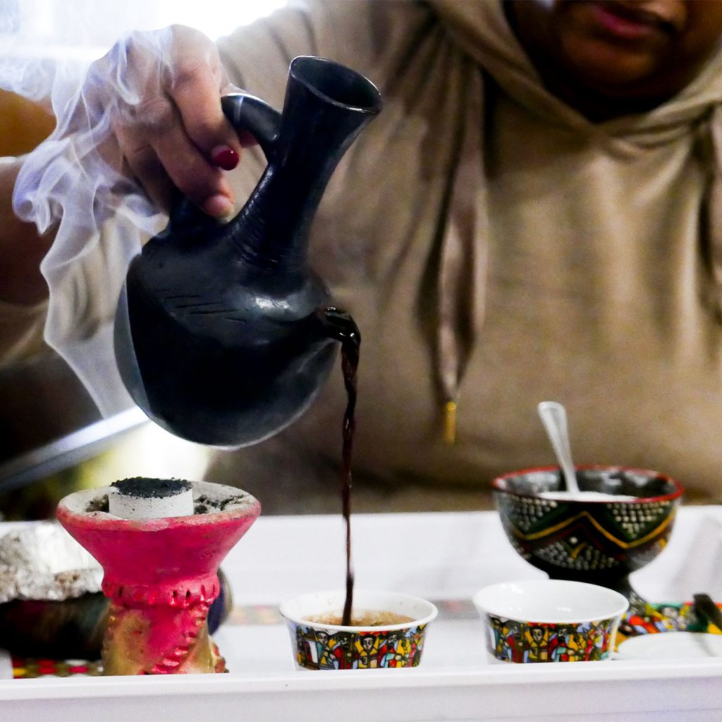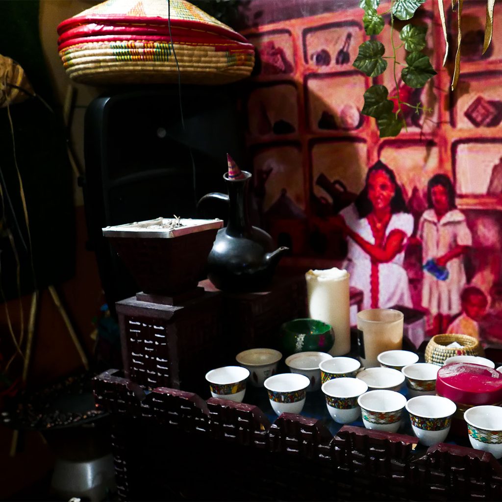 Habesha apre le sue porte nel 2016 da una sfida e una ricerca personale di Germana, arrivata nel 2007 da Tigrai in Etiopia, grazie al decreto flussi lavorativo. A Bologna, dopo aver seguito un corso serale di automeccanica, fatto la babysitter per sette anni e gestito un bar, capisce che non è quella la sua strada. Non è il bancone ma la cucina il luogo in cui vuole ritrovarsi. L’incenso sprigiona tutto il suo profumo, mentre parliamo e beviamo il caffè secondo il rituale etiope: “In Etiopia”, mi dice Germana, “il caffè viene prima cotto su una piastra e poi viene portato a bollore. Si lascia riposare per qualche minuto, perché la polvere si depositi sul fondo. Si beve al massimo tre volte per il giorno – quattro per le principesse – e ogni occasione ha il suo nome: Abol, la prima, poi Tona, e l’ultima di benedizione è Baraka”.