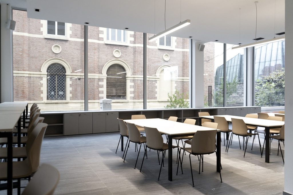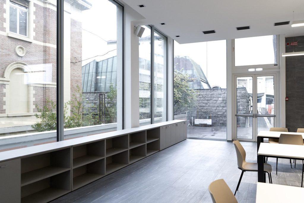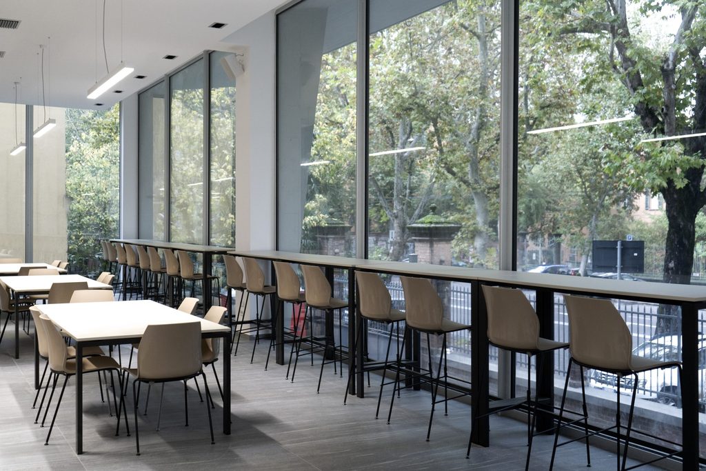 2mila metri quadri su quattro piani che ospitano nuovi laboratori e aule che accolgono percorsi accademici diversi e un’ampia sala a piano terra di circa 170 metri quadrati delimitata da pareti vetrate che si affacciano su via Irnerio dove studentesse e studenti possono incontrarsi, mangiare e condividere momenti di quotidianità.
