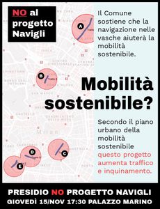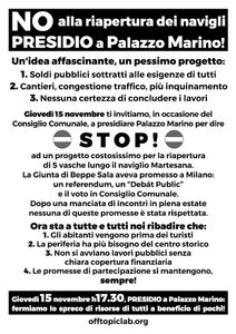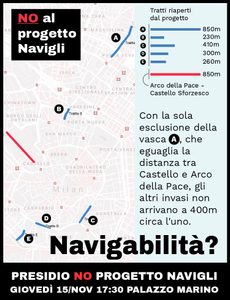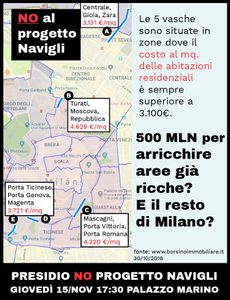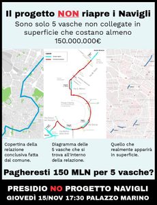 «Il 15 novembre con Offtopic saremo sotto Palazzo Marino dalle 17:30 per dire che i 150mln di € per la finta riapertura parziale dei Navigli sono soldi buttati a solo beneficio di turisti e città vetrina. Vogliamo una Milano città pubblica, dove i bisogni di chi la vive vengano prima e siano più importanti di un brand». In pochissime parole e con delle immagini chiare ed efficaci i promotori del presidio contro il progetto Navigli chiariscono una serie di concetti che la retorica ufficiale promulgata dalla stampa continua a oscurare: il primo, fondamentale, è che il progetto non riapre alcun naviglio, ma solo 5 vasche, di cui 4 lunghe meno di 400 metri. Il secondo, che discende dal primo, è che le vasche NON saranno navigabili. Il terzo è che il costo di questa operazione, confrontata con il suo obbiettivo modesto, è elevatissimo (minimo 150 milioni di euro, che facilmente cresceranno fino a 500). Il quarto, è che questi milioni vengono investiti IN CENTRO, su aree che hanno valori immobiliari elevatissimi, mentre in periferia si investono cifre minuscole rispetto a queste, e le scuole pubbliche restano prive di manutenzione.
