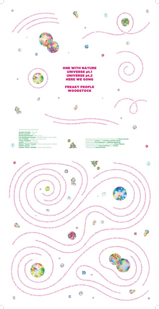 «Il gruppo è composto da due anime: da un lato c’è la semplicità, la spensieratezza e la stupidità degli amici che stanno bene insieme a suonare, i cosiddetti “Faryd Freaks”; dall’altro c’è una riflessione sulla società attuale partendo dai nostri messaggi utopici che sentiamo nel profondo del cuore. Come emerge dai testi delle canzoni, non vogliamo abbandonare l’idea di un mondo migliore: oggi sembra impossibile pensare a un mondo pieno di intensa umanità, dove essere accoglienti, ascoltare gli altri e amare sinceramente siano atteggiamenti che prevalgono sul resto. Tutto diventa utopia: qualcosa che solo i pazzi possono pensare e permettersi come realtà. Tuttavia, se si pensa profondamente all’utopia, l’utopia diventerà realtà». “Utopia” è una delle parole chiave per entrare nel suono degli Al Doum and the Faryds e “utopico” è il viaggio che attraversa tutto il disco, fino a quella “Woodstock” conclusiva che in dieci minuti parte da un ritmo jazz essenziale per esplodere in un tripudio di colori, versi liberatori, crescendo gospel ed echi lisergici in cui la parola “together” ricorre a segnare la via. Utopia è anche mettere insieme una band di dieci persone, tra componenti storici e nuovi, che su questo disco sono Antonio Paciello (sax alto), Cecilia Iaconelli (voce), Davide Domenichini (basso e voce), Ivan Guillaume Cosenza (Fender Rhodes, voce, flauti), Ivan 2 Maddio (sax tenore e soprano), Jimmy Catagnoli (sax alto), Lorenz (chitarra e percussioni), Matteo “Sauron” Saronni (batteria, percussioni, clarinetto), Martina Lazzeri (voce), Stefano “Puma” Tamagni (batteria, percussioni).