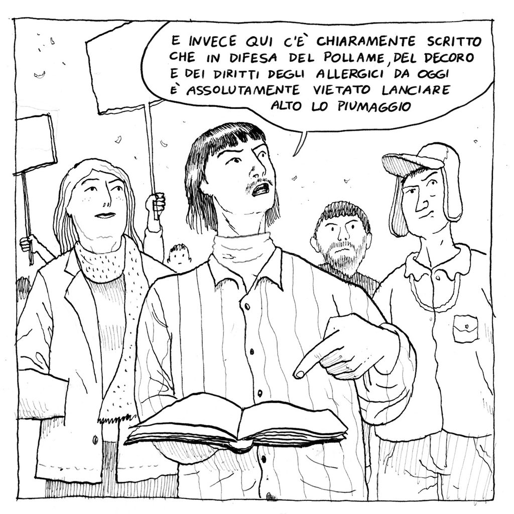 Stolto è colui che punta l’indice contro lo smanicato indossato coattamente già ai primi soffi di vento di settembre e abbandonato solo per i mesi estivi. Ne fa questione di volgarità e ignoranza, quando lui stesso ignora la storia del multiverso della sua città. Le piume della sua imbottitura e la spavalderia ostinata che pervade chi lo indossa, sono in realtà l’eredità di un rito praticato durante una lunga era di prosperità, quando era credenza comune che bastasse lanciare in aria le penne di qualche gallina per ottenere protezione, incolumità e lunga vita. Poi venne il solito corteo con partenza alle 15:00 da Piazza della Repubblica a rovinare tutto…