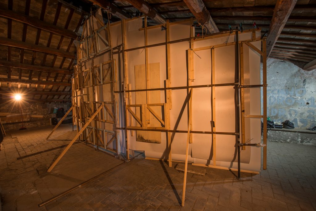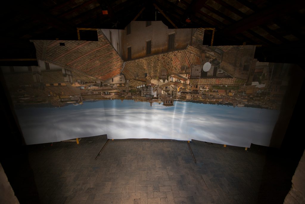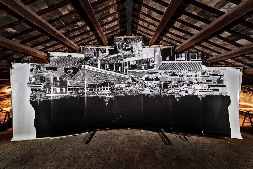 E se pensate che riuscire a trovare uno spazio tramite intercessione clericale sia stata la parte più difficile, sappiate che vi sbagliate, perché Gianmaria non ha camminato su e giù lungo la volta della navata centrale per stampare delle vedute di Roma in formato cartolina. Se si pensa in grande, si stampa in grande: non centimetri, ma metri di carta fotografica gelatinosa, appoggiati meticolosamente sopra una sorta di cavalletto gigante autocostruito di quasi nove metri per quattro e mezzo. In più, uno studio tanto artigianale quanto attento della luce e dei tempi d’esposizione, in modo da ottenere immagini pulite, nitide, con una defezione alta e soprattutto senza bruciature da sovraesposizione – quindi sì, immaginate Gianmaria e altre persone fare ombra sulla carta con superfici ritagliate improvvissando e poi arrotolare tutto di corsa per andare a sviluppare dei “rullini” di dimensioni industriali.