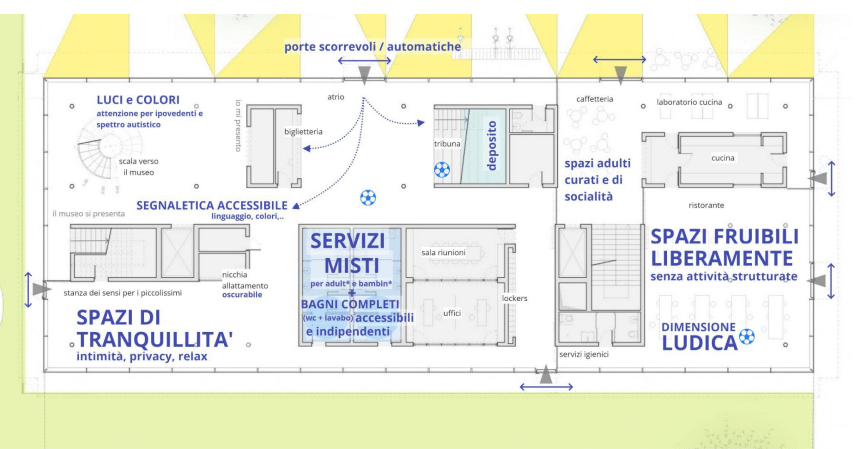 Oltre all’ispirazione ai cosiddetti children’s museums – che nelle altre città italiane (Roma, Milano, Verona, Genova) sono però luoghi privati – le poche indicazioni disponibili al momento riguardano soprattutto l’organizzazione degli spazi: ristorante/bar a piano terra, sale multifunzionali per laboratori, atelier creativi, aree sensoriali per la prima infanzia e spazi flessibili pensati più per attività educative.
