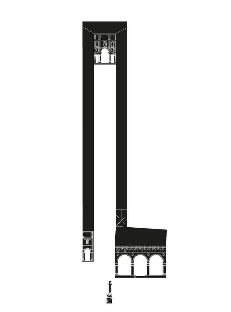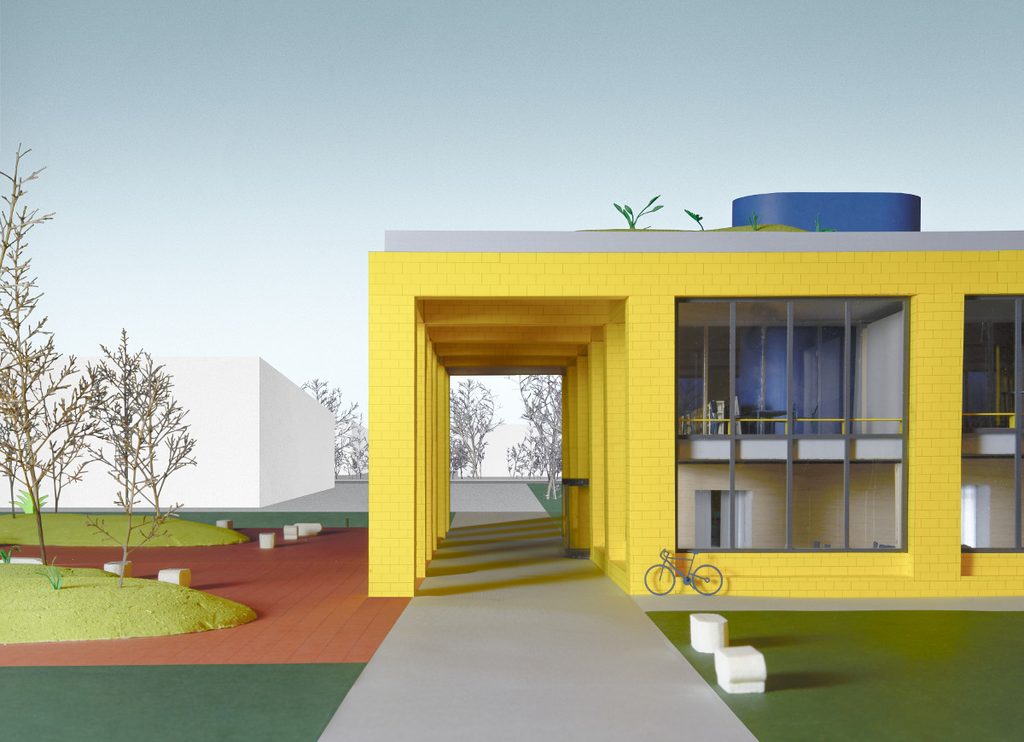 Il padiglione è uno spazio vuoto con pianta quadrata e contiene una struttura gialla: un elemento autonomo che abita lo spazio voltato creato dalla sua forma esterna e che può essere reinterpretato dai diversi autori invitati a esporre al suo interno. Per questa prima