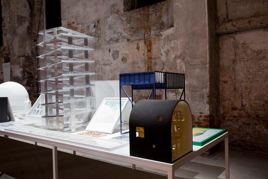 Il disegno di Ettore non aveva alcuna funzione definita. Noi abbiamo immaginato inizialmente che potesse essere una casa, una casa isolata di fronte al mare. Esiste un documentario sul lavoro di Sottsass dove, per alcuni istanti, lo si vede nel patio della sua casa a Filicudi mentre colora davanti al mare la volta nera di “Architettura monumentale”. Ci eravamo inizialmente ispirati a questa immagine. Poi le esigenze curatoriali della Biennale di Orléans e le intuizioni di Damani ci hanno poi spinto a reinterpretarlo come “Cabinet of Curiosities”.