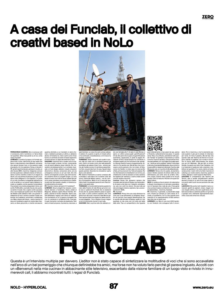 Questa è un’intervista multipla per davvero. L’editor non è stato capace di sintetizzare la moltitudine di voci che si sono accavallate nell’arco di un bel pomeriggio che chiunque definirebbe tra amici, indossando birkenstock blu su un parquet scaldato da un tappeto. Ma forse non ha voluto farlo perché gli pareva ingiusto. Accolti con un «Benvenuti nella mia cucina» in abbacinante stile televisivo, esacerbato dalla visione familiare di un luogo visto e rivisto in innumerevoli call, li abbiamo incontrati tutti: i regaz di Funclab.