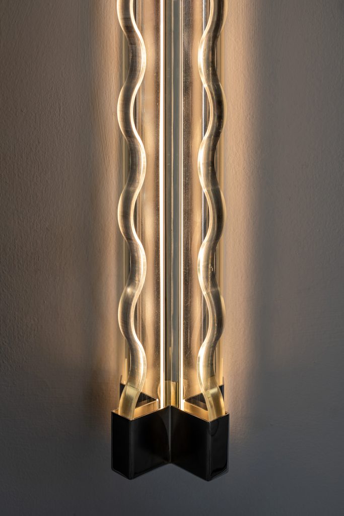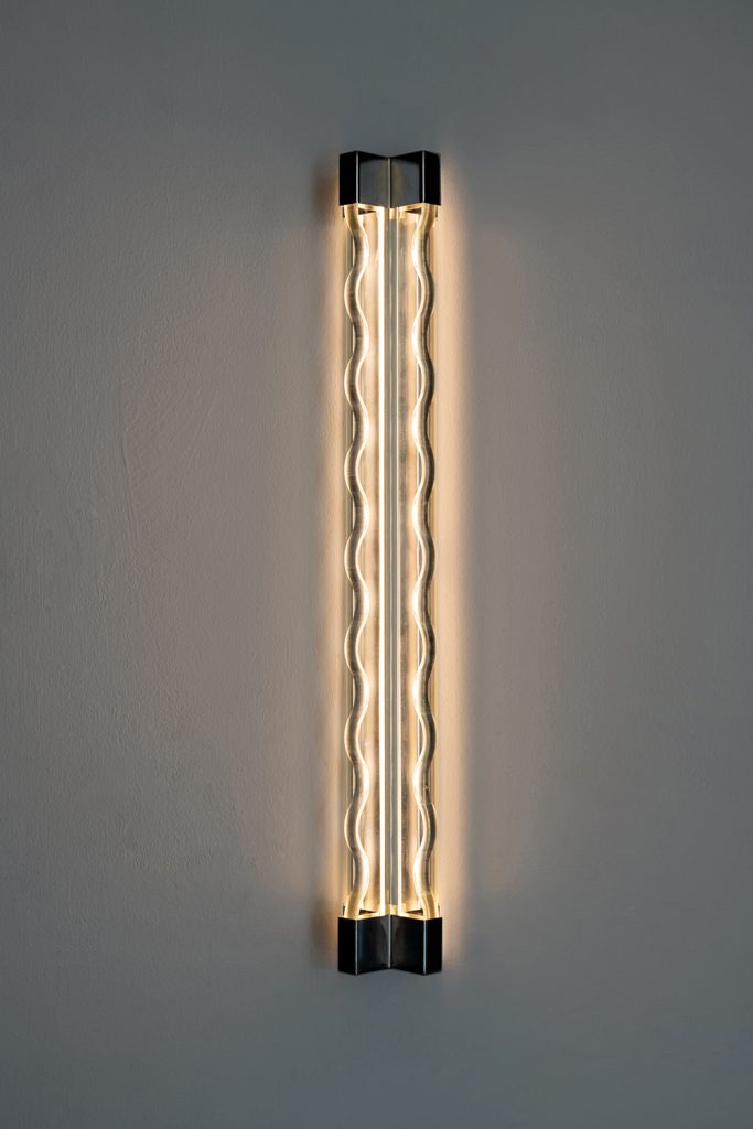 Quest’idea di partecipare al catalogo di FontanaArte era un pensiero quasi proibito, troppo grande per considerarlo fattibile. Devo un sincero ringraziamento a tutte le persone che hanno collaborato affinché questo progetto diventasse realtà: dallo stupendo Francesco Librizzi al team di FontanaArte fino agli amici di 6:AM – Francesco Palù ed Edoardo Pandolfo – con cui abbiamo sviluppato la parte tecnica di questa lampada. Insomma, non era facile: è un applique squadrata ma anche ondulata, che riproduce delle forme art-déco. Ci siamo infatti ispirati a un grande designer francese di quell’epoca, Maurice Lacroix. Allo stesso tempo però ho voluto affermare un po’ la mia identità e quella dello studio, donando all’applique una dimensione squisitamente contemporanea: un po’ buffa e un po’ scherzosa, ma anche sinuosa e sensuale. Abbiamo deciso di chiamare questa lampada “Frenesi” e posso dire che farà parte di una serie: diventerà perciò una mezza applique, un abat-jour, una piantana sdraiata e infine un lampadario.