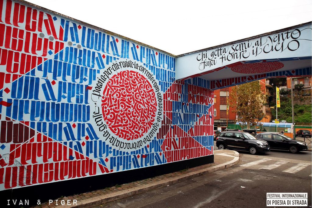 Scriviamo d’istinto se abbiamo un’immediata ispirazione e stiamo davanti al muro “giusto”, ma questo accade sempre più raramente perché il nostro progetto si sta evolvendo, vogliamo sperimentare nuovi linguaggi. E per questo invece ci vuole tanta progettazione e pianificazione. Scrivere richiede uno sforzo e un impegno che non vengono solo con l’ispirazione e l’immediatezza. Oltretutto, già da un po’ ci sono a Roma decine di poeti di strada che con pseudonimi scrivono sui muri come facevamo noi dieci anni fa: lasciamo la carta a loro. Sì, a volte abbiamo scritto in base al quartiere dove ci trovavamo, in particolare quando abbiamo fatto parlare monumenti o edifici, come il Colosseo, o il Palazzo della Civiltà dell’Eur.
