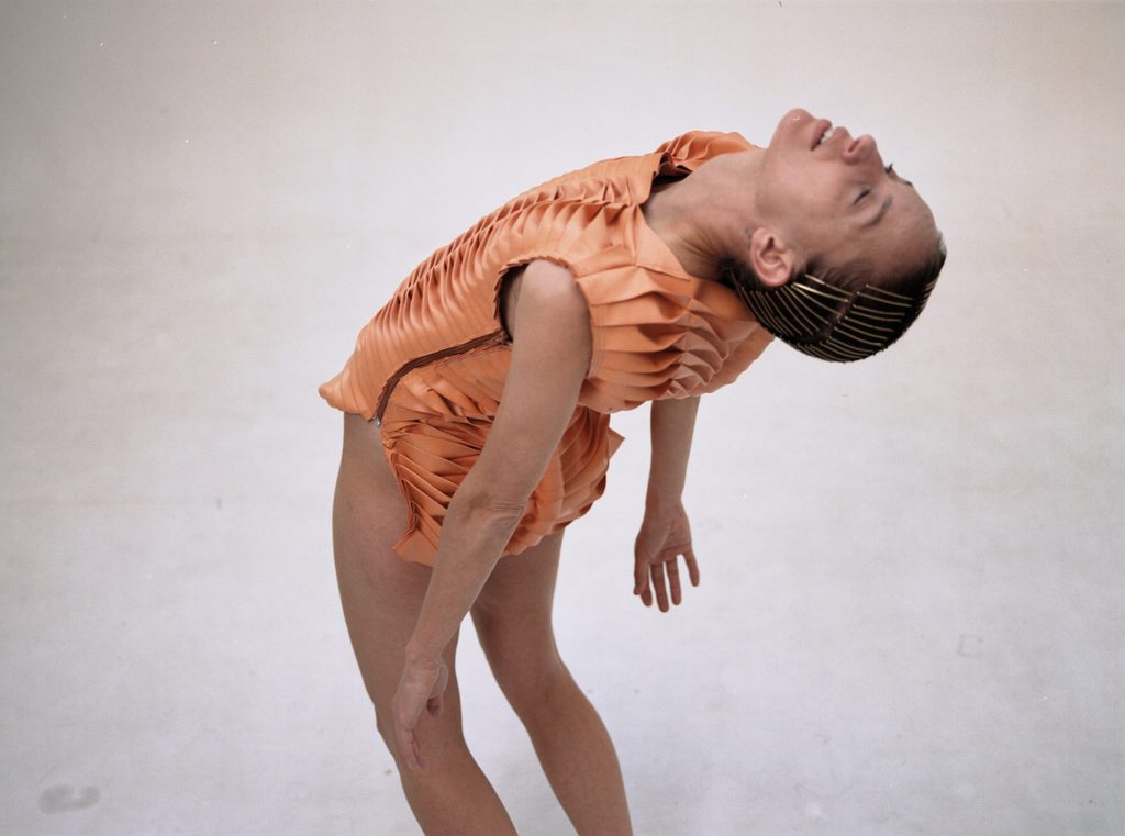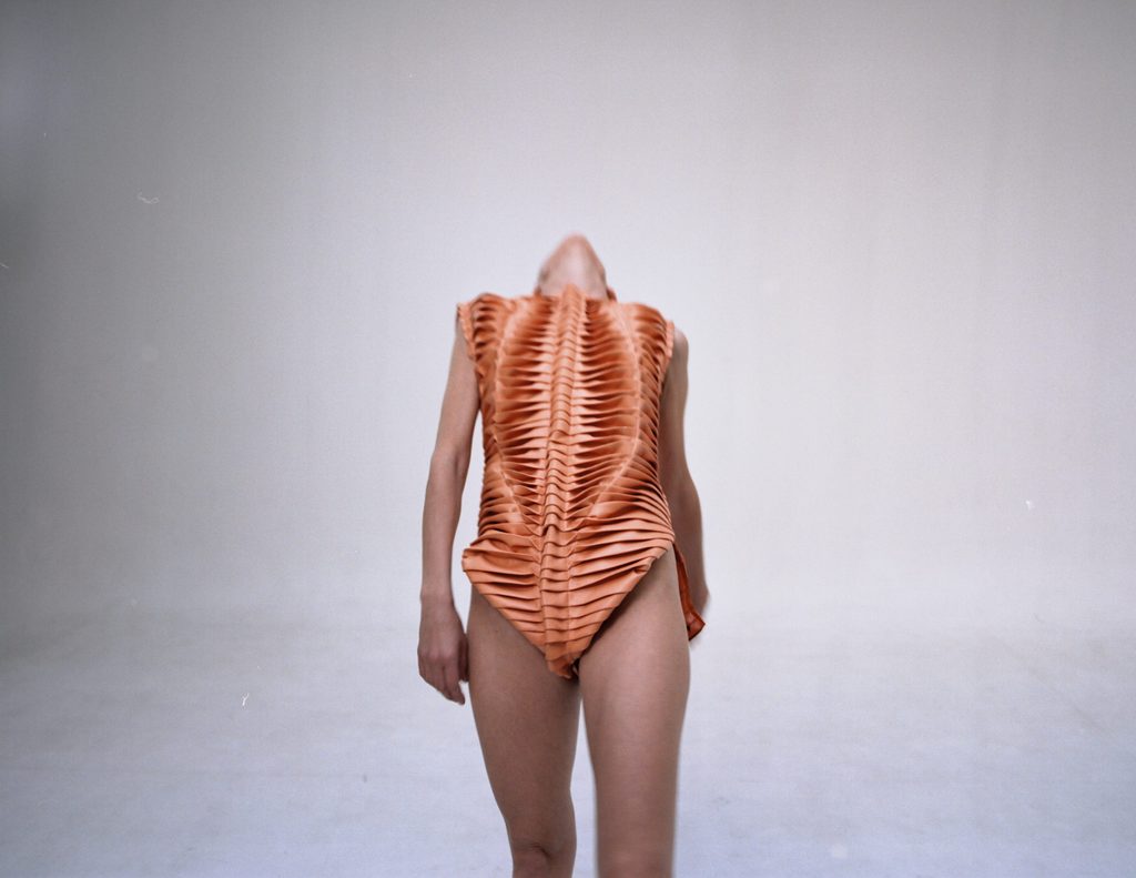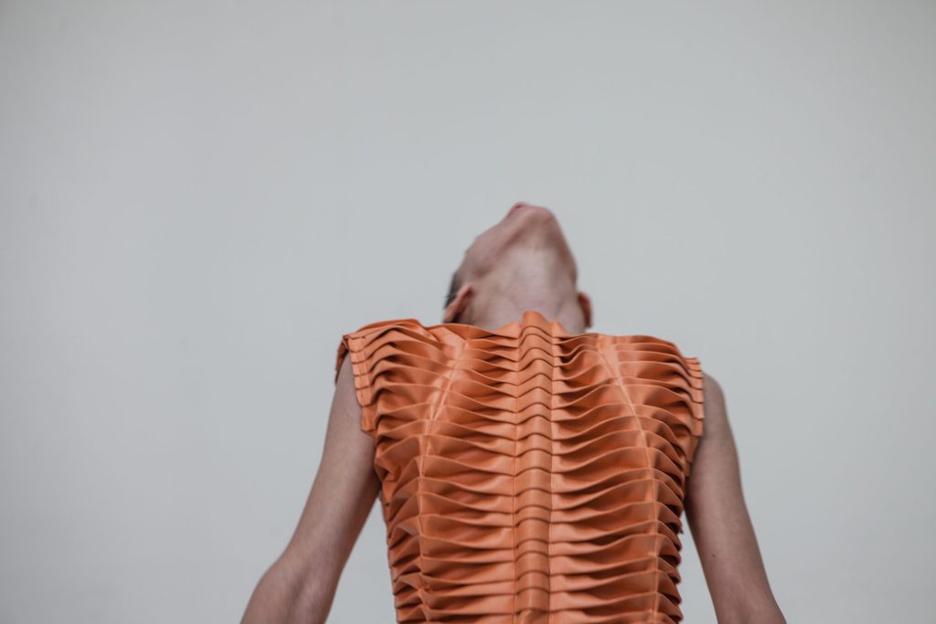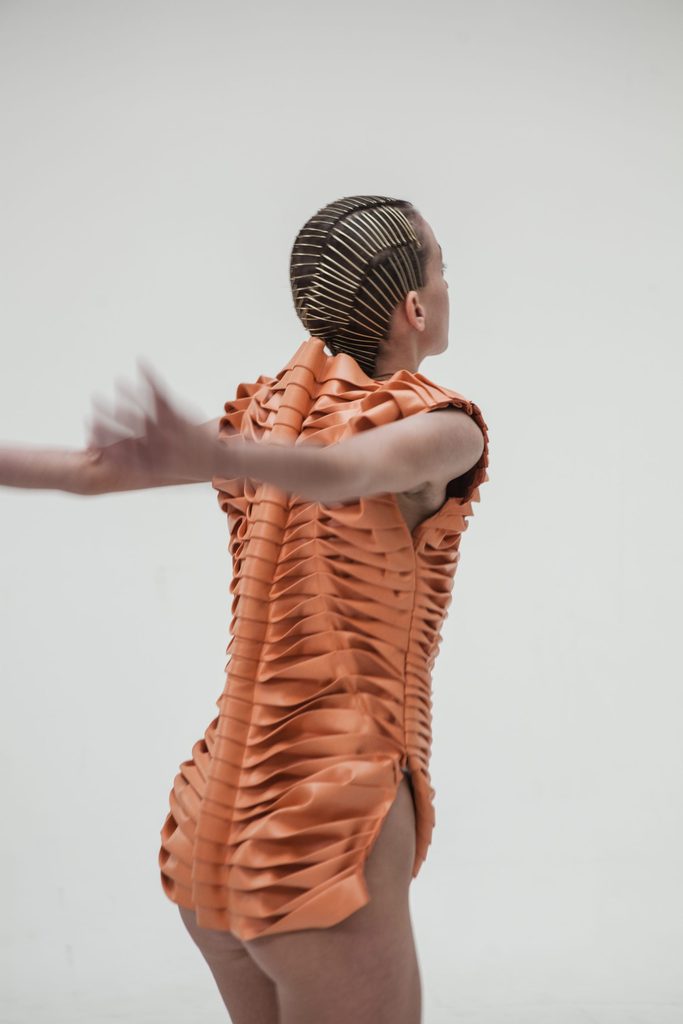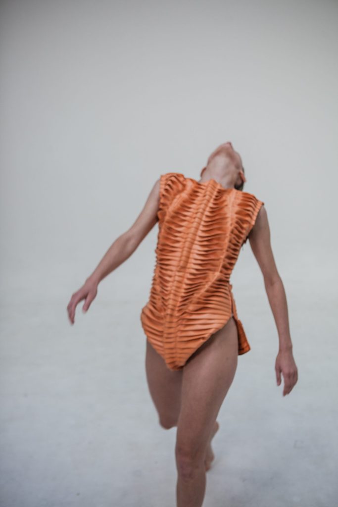 In scena c’è Valentina Sansone, alla quale ho affidato i miei pensieri e donato pezzi di me, in una performance che rientra nell’ambito della danza e si occupa di un’indagine sull’inconsuetudine di avanzare all’indietro. Insieme al costumista Vittorio Gargiuolo abbiamo ideato un abito che richiamasse la struttura esoscheletrica dei crostacei e che lasciasse come punto saldo dell’intelaiatura la configurazione della colonna vertebrale umana, sia sul dietro che sul davanti del costume. Si tratta di una scultura in pelle ricavata interamente con materiali di scarto e di riciclo. In dialogo con l’idea del lavoro, il tessuto è rovesciato, cucito al contrario, per cui appare visibile il suo retro. A partire dal costume per arrivare all’acconciatura, l’estetica della performer strizza l’occhio alla figura umanoide, e in questo senso l’andare indietro suggerisce un immaginario futuro.